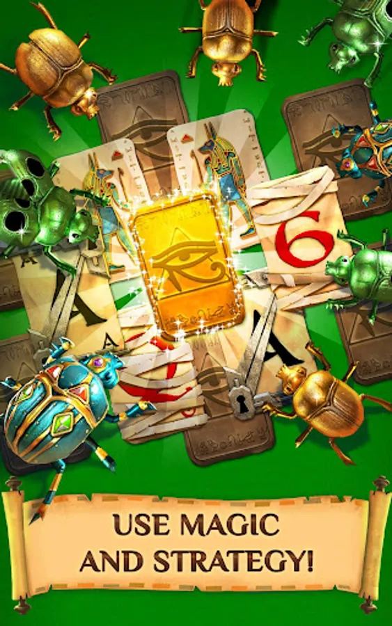 Find the clues by catching the Scarabs hidden beneath the cards. You can match a card that is one higher or lower than the one on your deck. Beat the levels and the Scarabs will reveal hidden lost to the ancient world and the magic that’s locked within!
