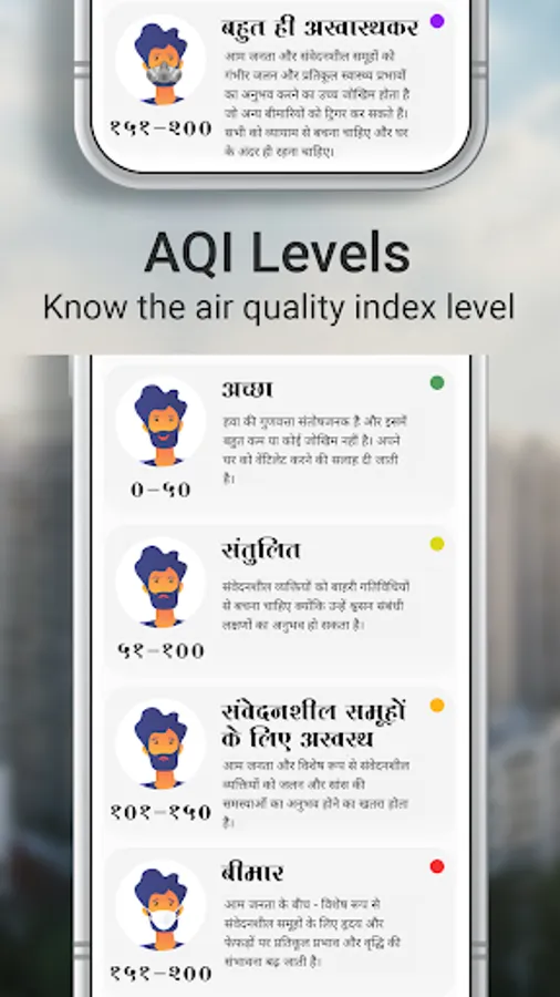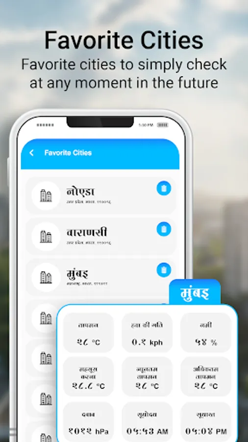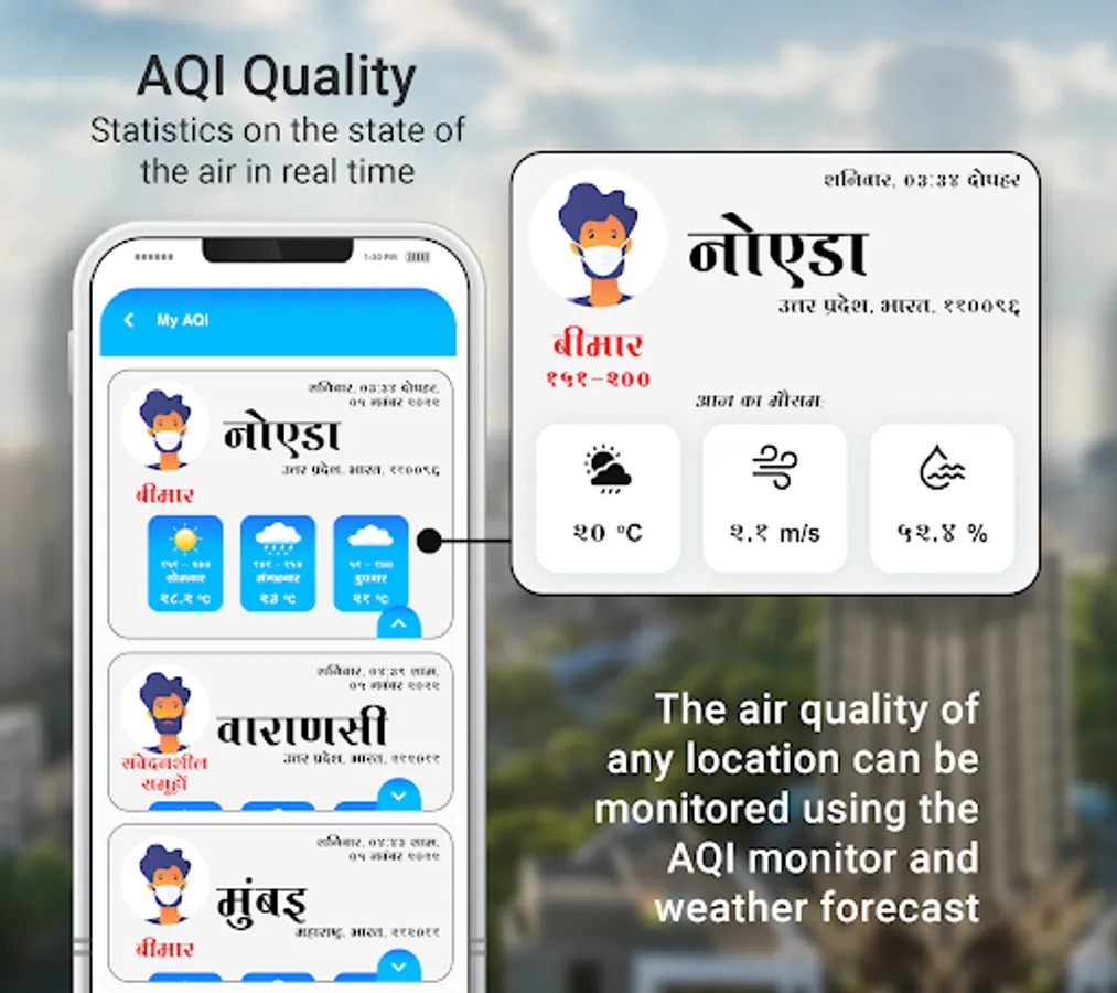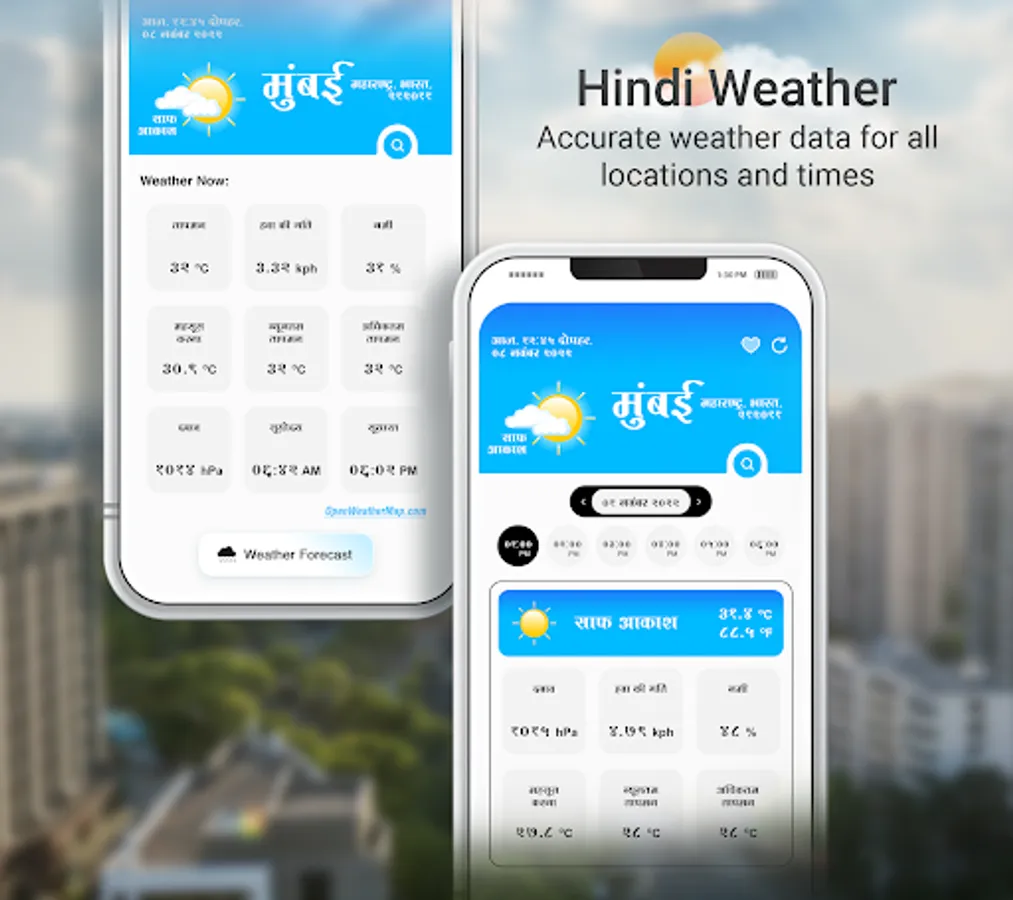 Get current & forecast weather information of any location in Hindi language. Also get real time Air Quality Index (AQI) of your current city. Also you can select any city to get weather information, weather forecast with AQI levels and sunset / sunrise timings - all this in HINDI.
