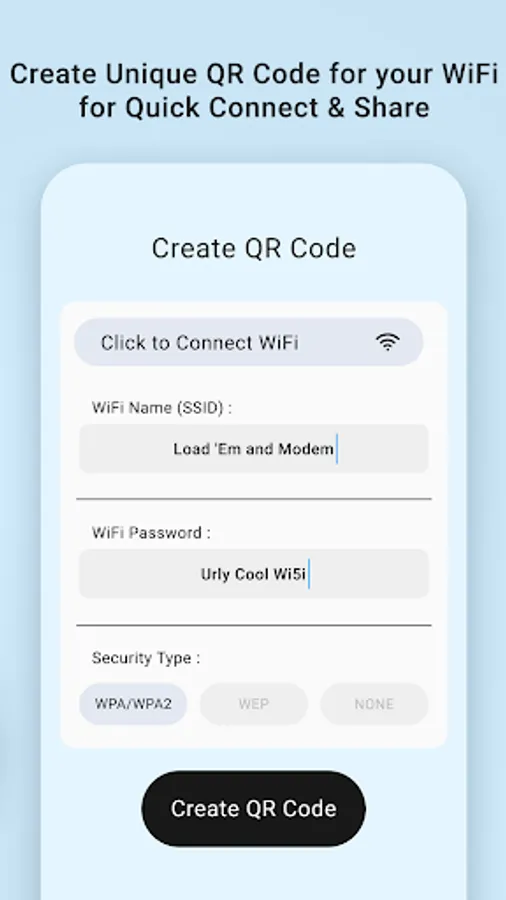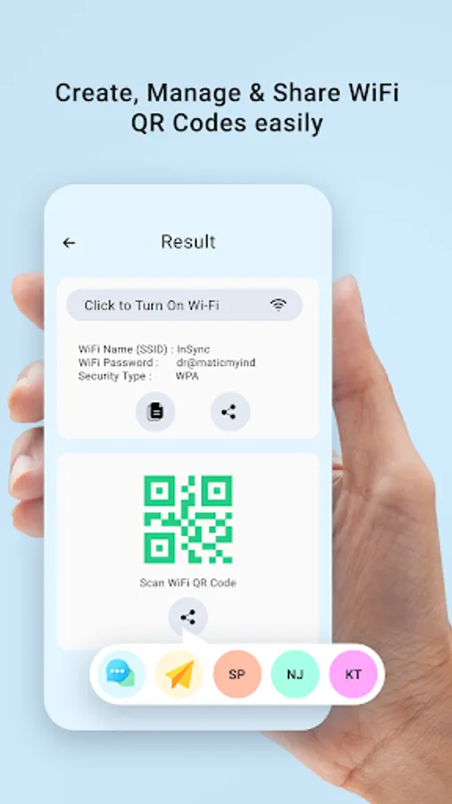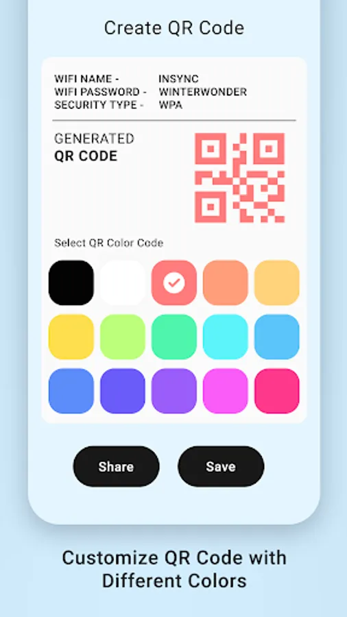 - Save and share created WIFI QR codes.