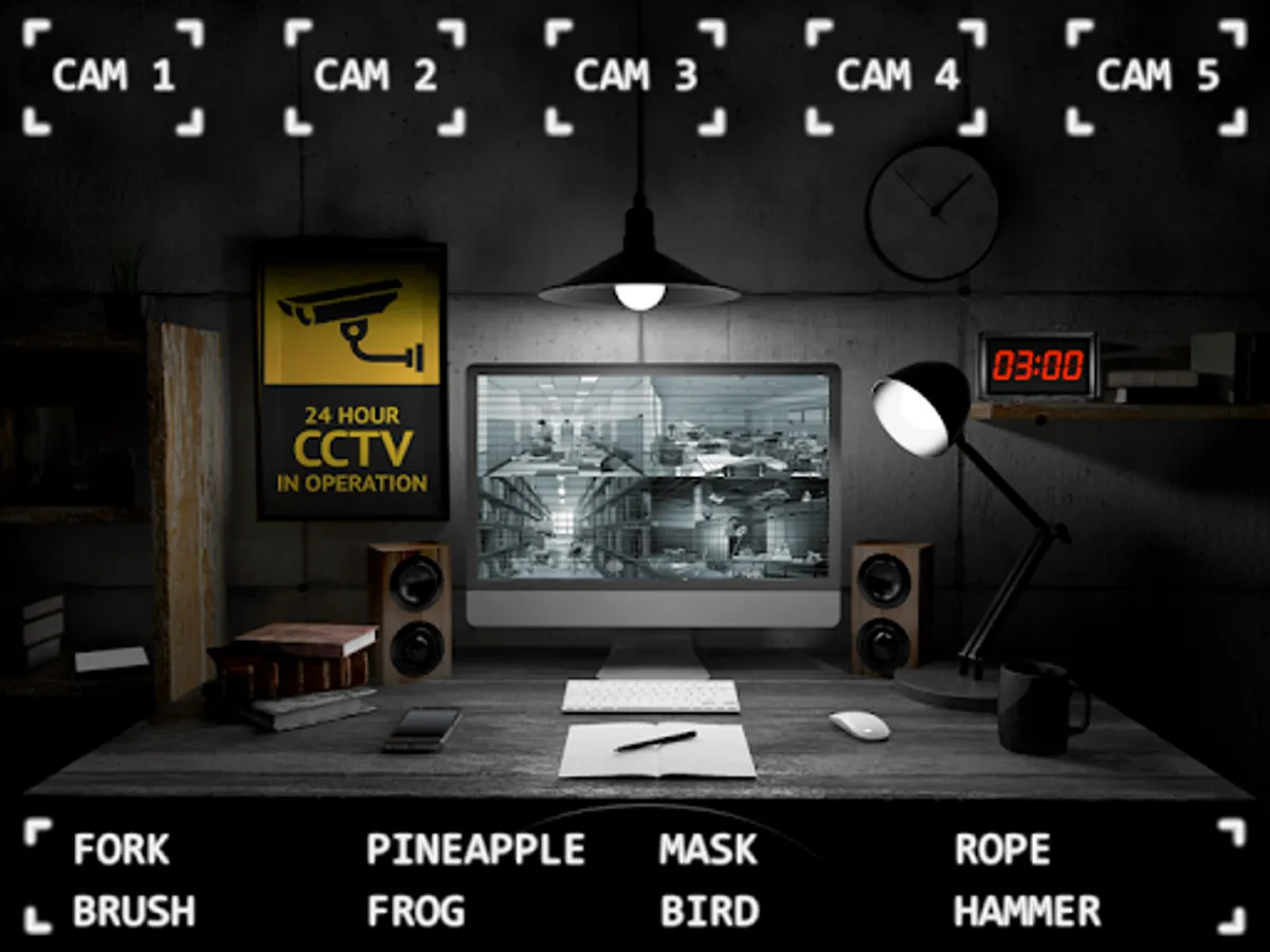 A dinosaur outbreak has happened right in the middle of your school day! You manage to hide out in the old security room, buy you need to escape the school before the dinosaurs find you. Use the security cameras to find the missing objects to escape. Be quick as you only have till 5:00PM.