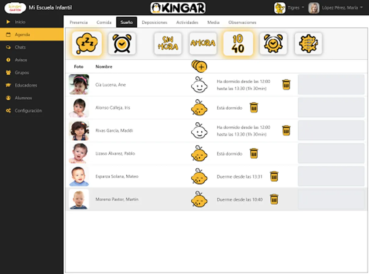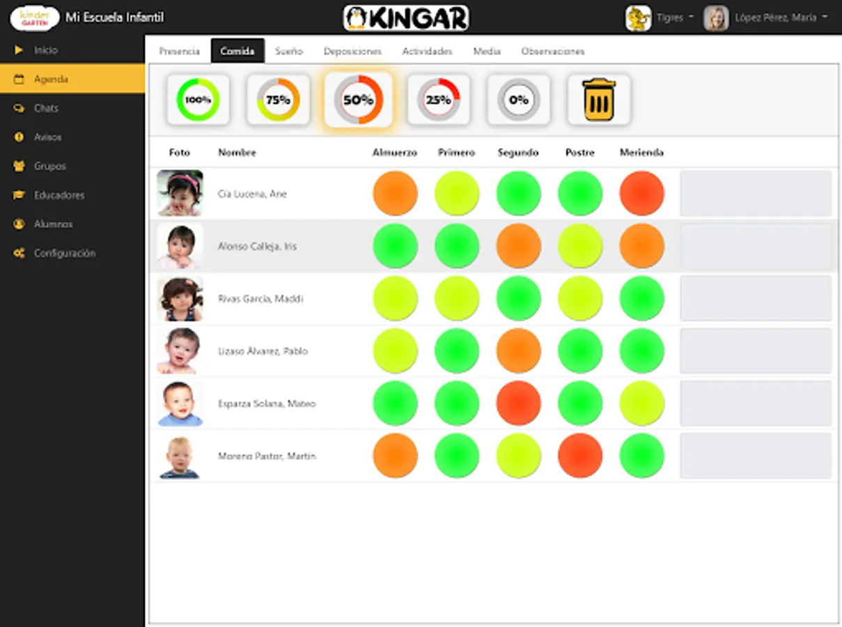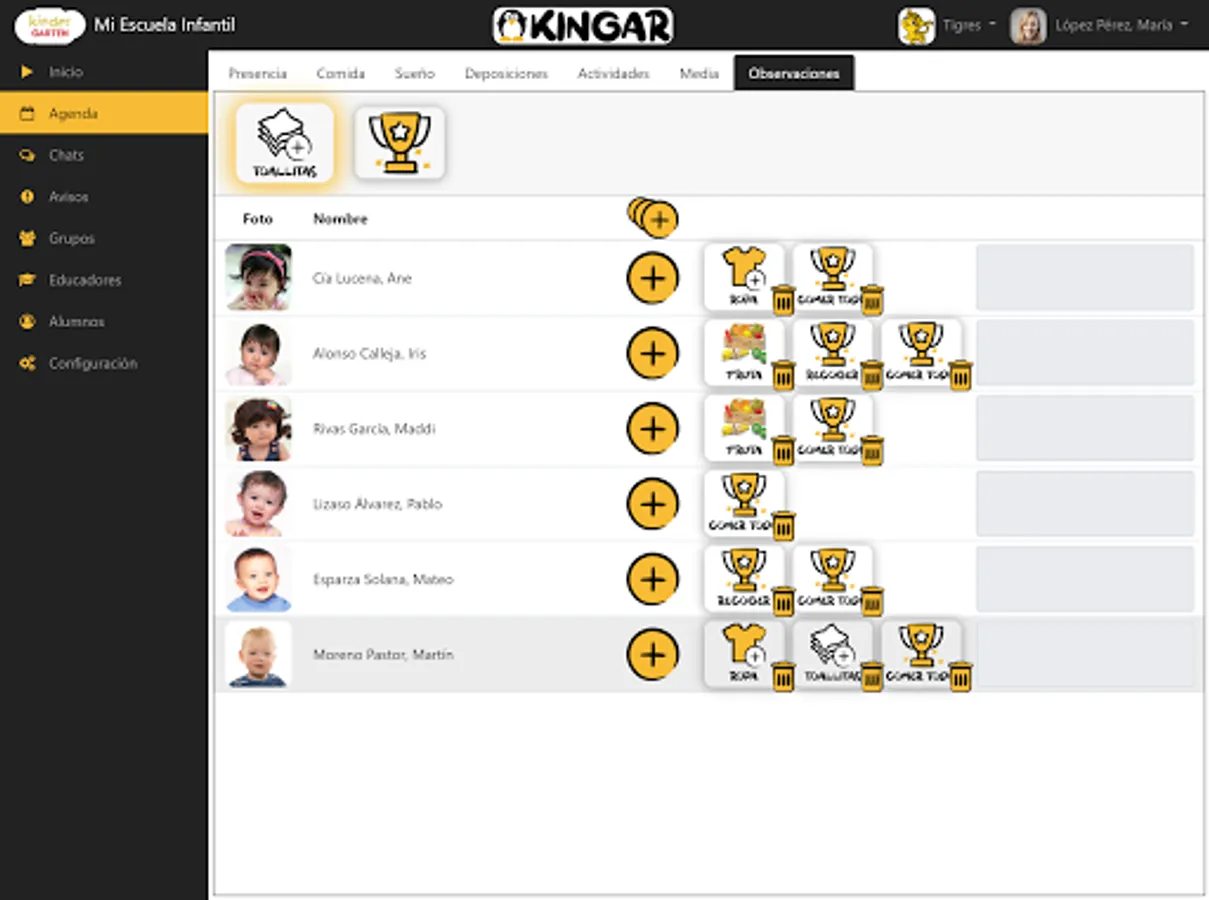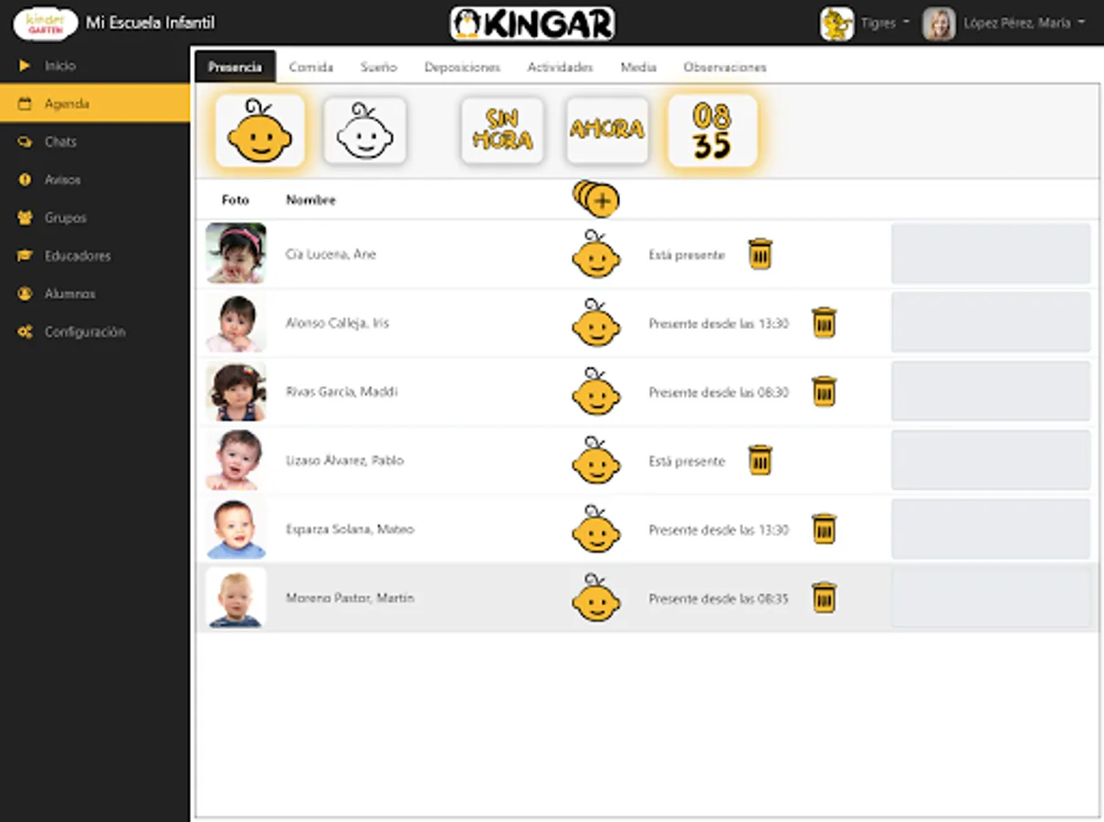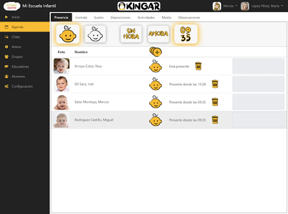It allows to store all the information related to day to day in the nursery school (students' agendas), to configure the operation of the nursery school (groups, educators, students, relatives) and provides a centralized communication channel between the school (the educators) and the families of the students.