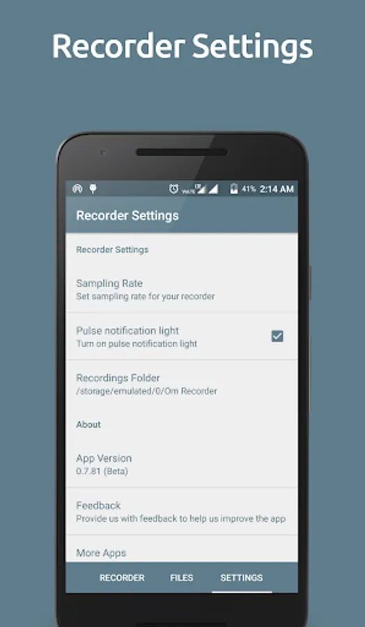 You can record HD sound with Wav format. With this Om Audio Recorder, its very easy way to record your meetings, personal notes, classes, songs, and more, with no time limits. This sound recorder has very simple and elegant user interface to meet your recording needs :)