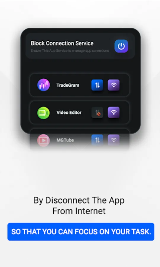 - VPN Service : VPN connection is required for the core functionality of the app. The apps core function is to disable internet apps for selected apps on launch of those apps. To do so we need to use VPN service so that we can block internet usage for those selected apps by user. .