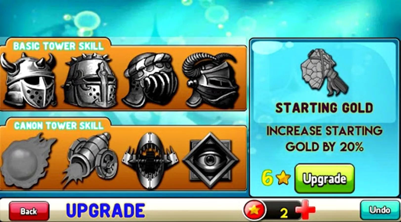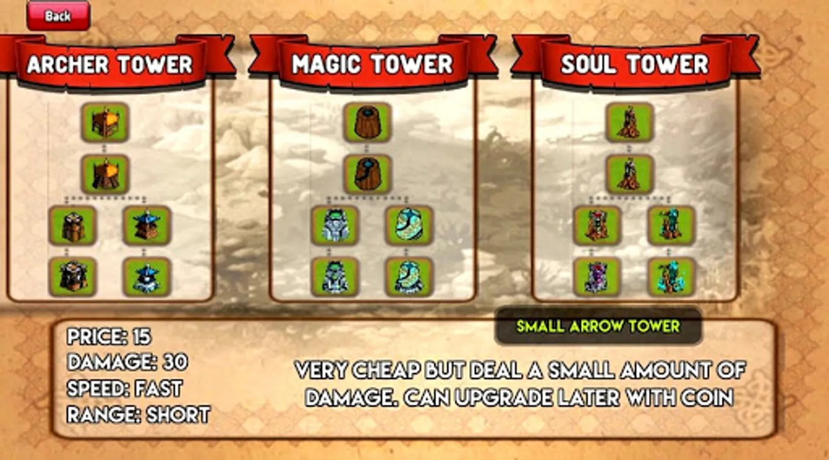 + 5 types of towers, Basic Tower, Canon Tower, Archer tower, Magic tower, Soul tower. Each tower has 4 upgrading levels.