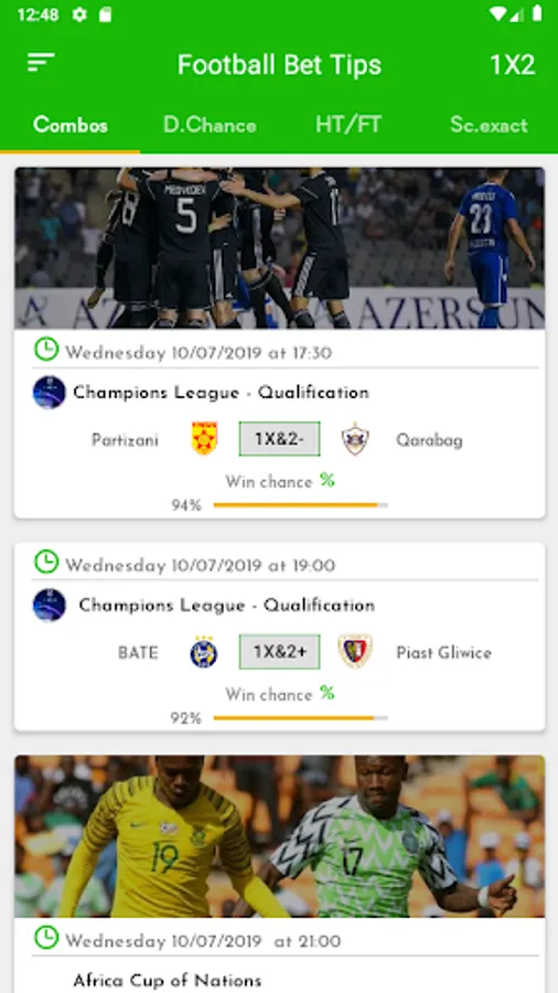✔ Our tips are classified according to 4 types of bets: combined, double chance, 1st / 2nd half, exact score.