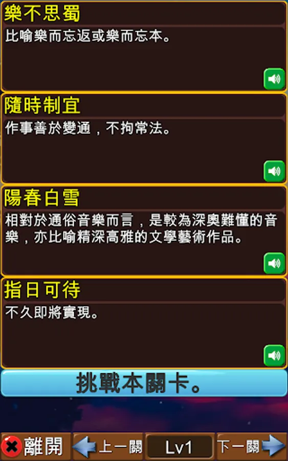 5.當玩者完成一個關卡,可以重選該關卡內的查看成語功能,裡面會列示本關中所出現的成語列表。