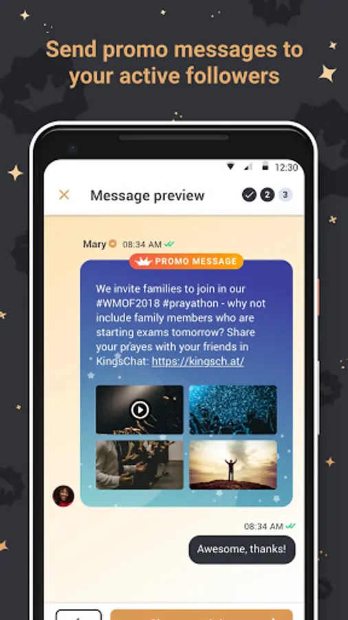 Chat 1on1 with your followers - chat with your beloved followers in KingsChat. Create new bonds and get to know better people who love your content.