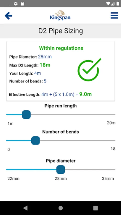 D2 PIPE SIZING tool will help you ensure your pipework is Building Regulations compliant. Just specify your pipe diameter, pipe run length and number of bends and you’ll know instantly if it falls within regulations.