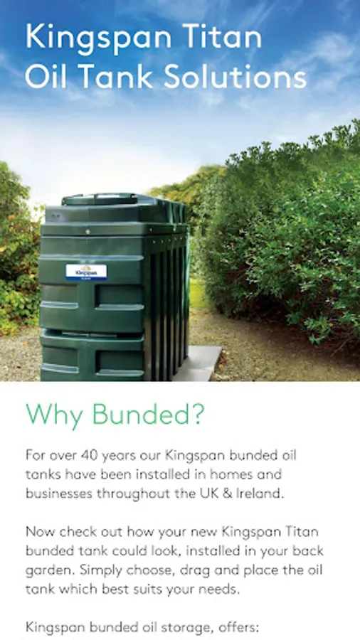 Easy to use, you will have access to Kingspan’s entire range of bunded oil tanks. With just a click of a button, the app uses augmented reality to superimpose a tank within your garden area, giving a useful preview as to how it will look once installed. Other sizes and shapes of tanks can be quickly and easily swapped in as needed so you are sure to select the right one.