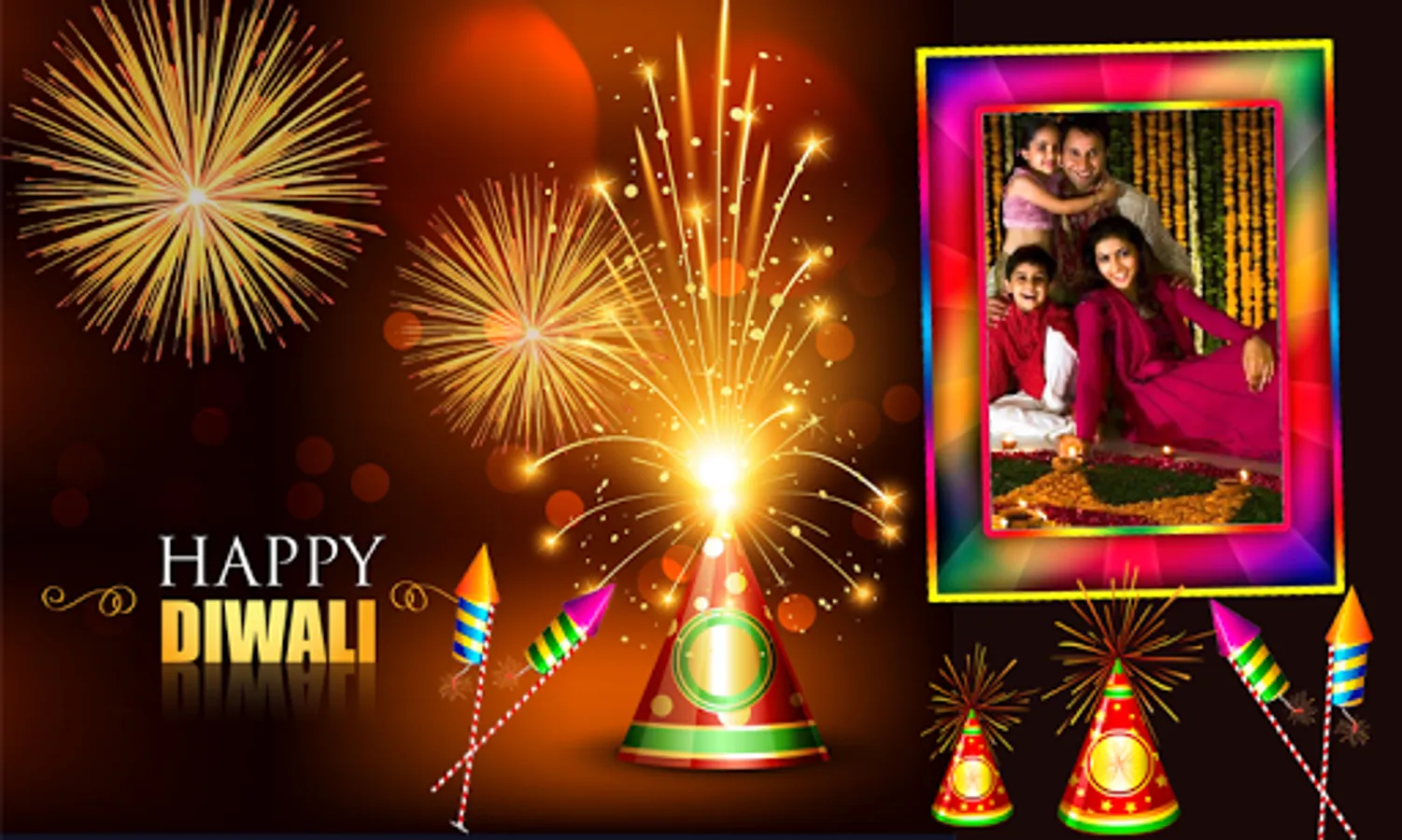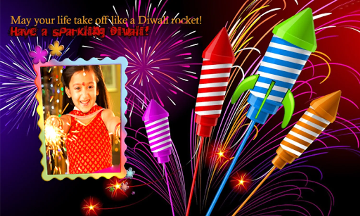 Select your photo from gallery or capture photo from your phone camera ,select your favourite Diwali photo frame from the collection and fit selected photo in template,zoom in ,zoom out ,rotate ,drag options are provided. save your designed photo frame in your electronic device, can set as wallpaper on your mobile screenand share your photo with family ,friends ,and relative ,one of way to greet and surprise them.
