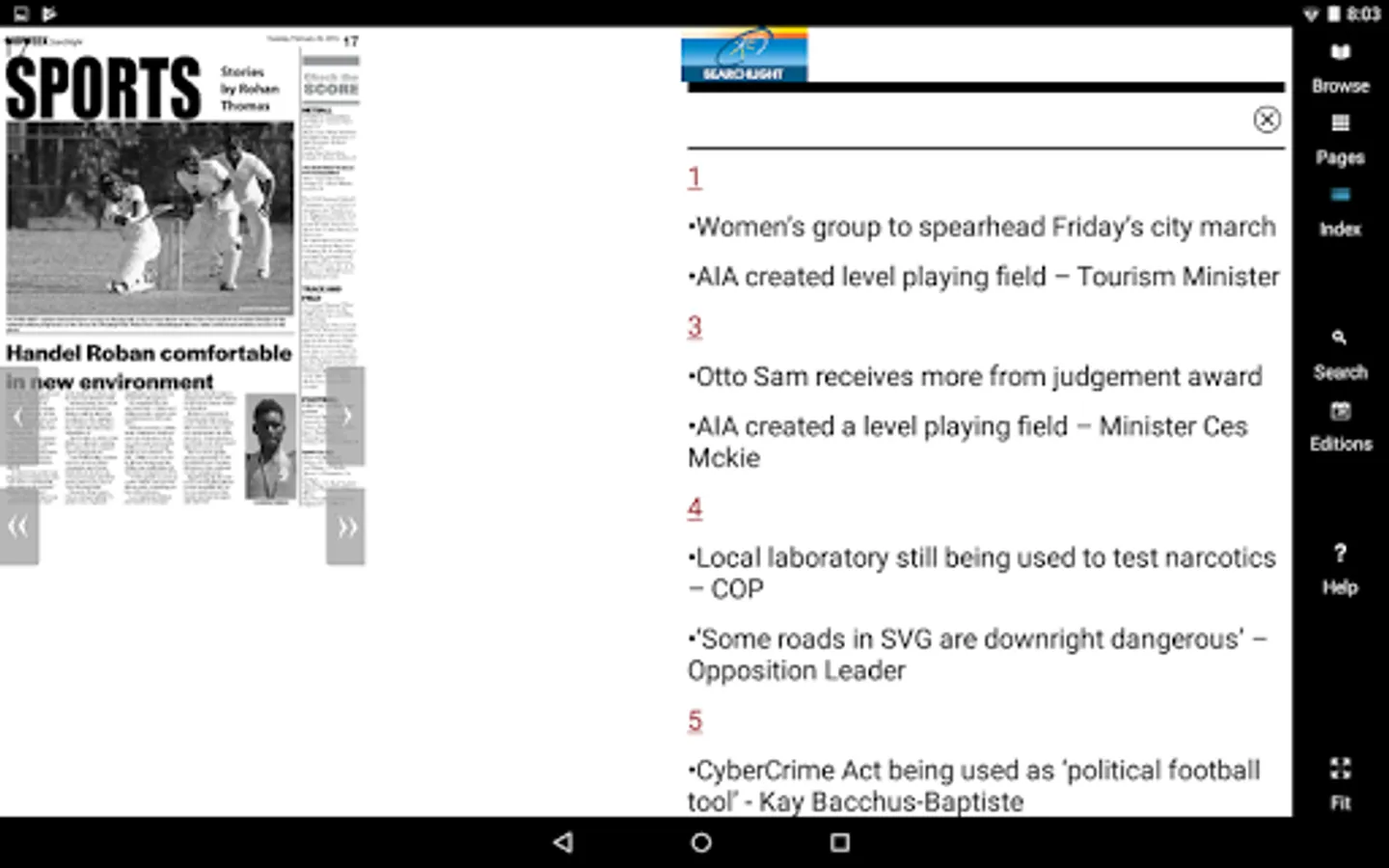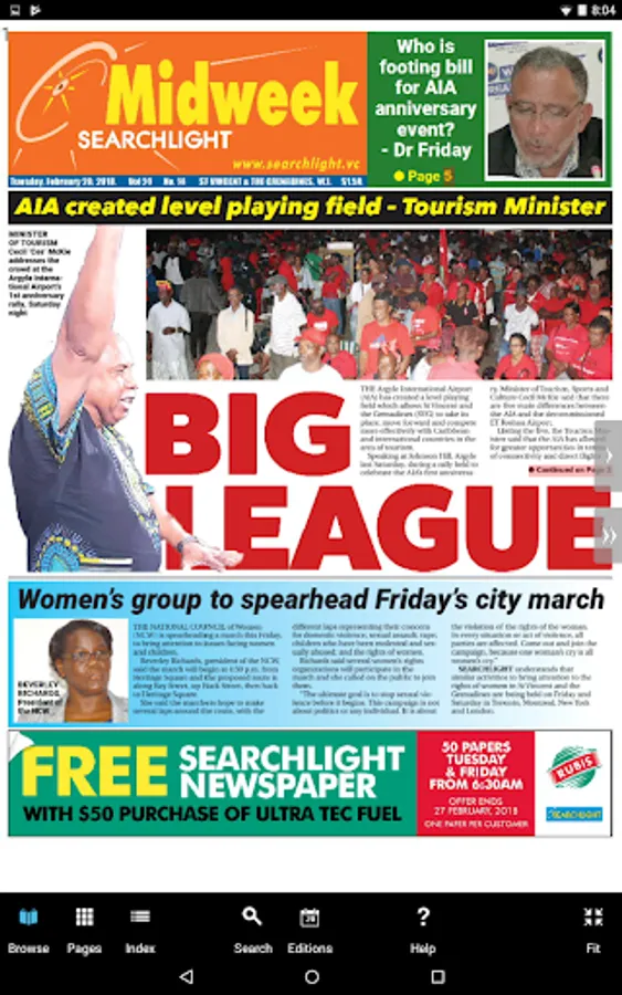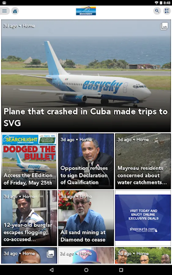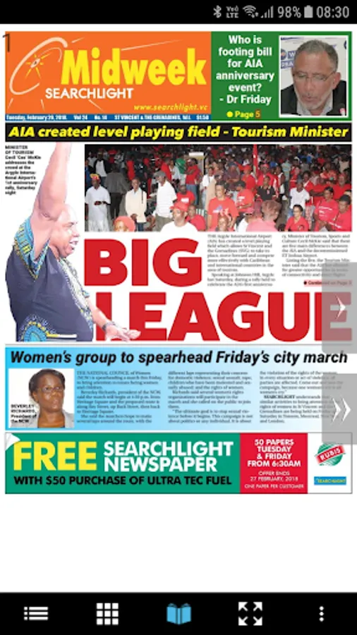 The Kingstown Searchlight eEdition app is an exact replica of the print edition which is published twice a week (Tuesdays and Fridays) in hard copy and as an e-paper and 24 hours a day, seven days a week on our social media platforms.