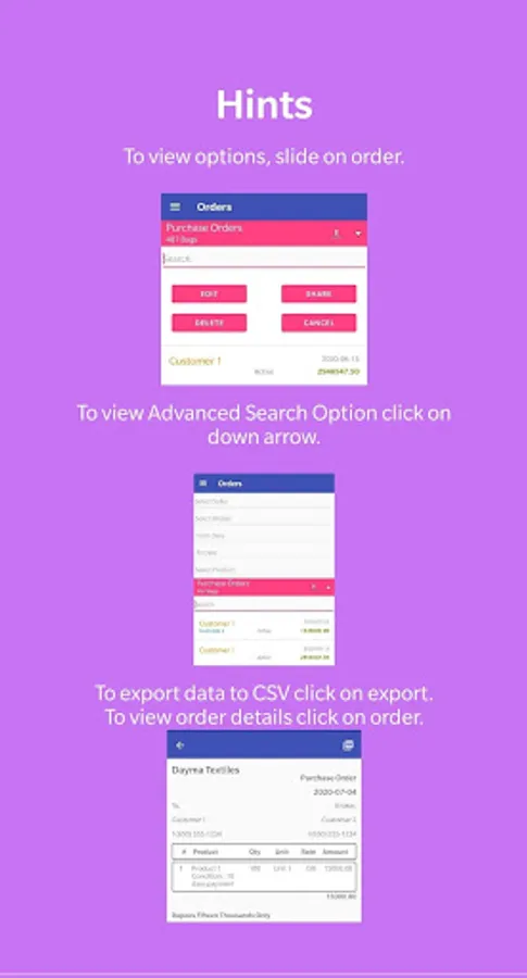 Make managing business orders easy with this user friendly app. You can SMS/WhatsApp/Share the transaction of an order to the respective audience. Add customers from phone-book. Take backups on local or google drive or export to csv. Search orders with advanced search option i.e. customer-wise, date-wise or product-wise.