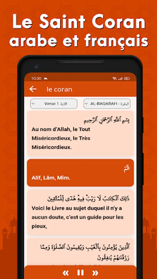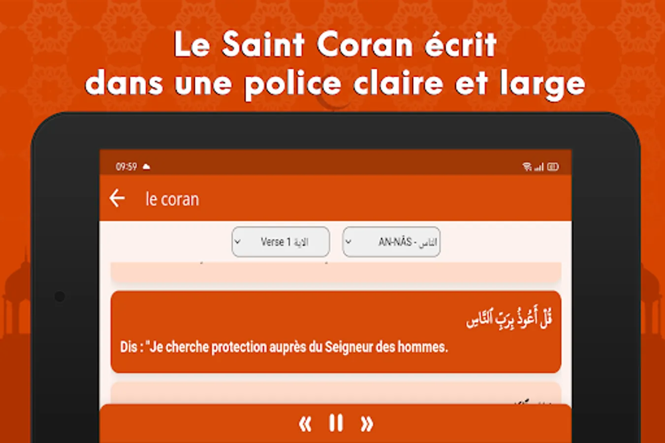 - Contrôler l’écoute du Quran (lecture, pause, verset suivant, le verset précédent, répéter le verset).