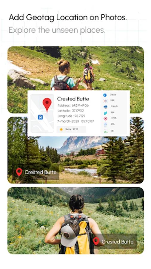 Be it your travel memories or your visit to a particular place, add date time, map, latitude and longitude, altitude, accurate weather, magnetic field, wind, and digital compass to your gallery photos, with GPS Camera - GPS Stamp On Map application.