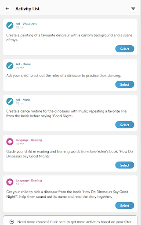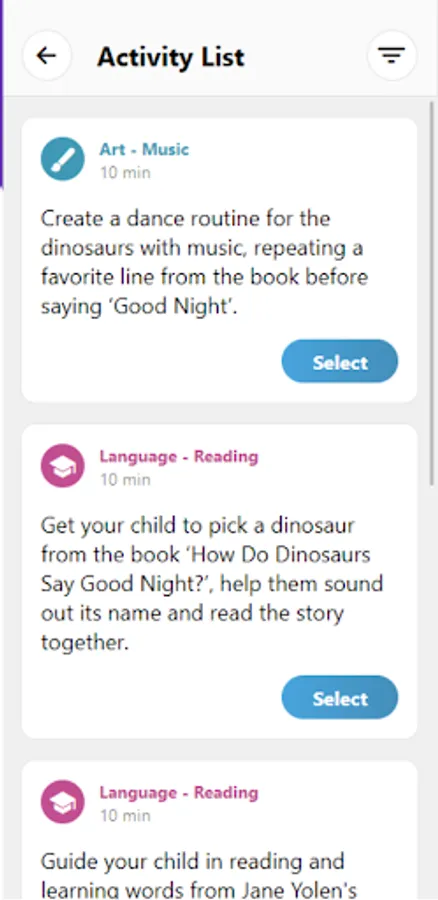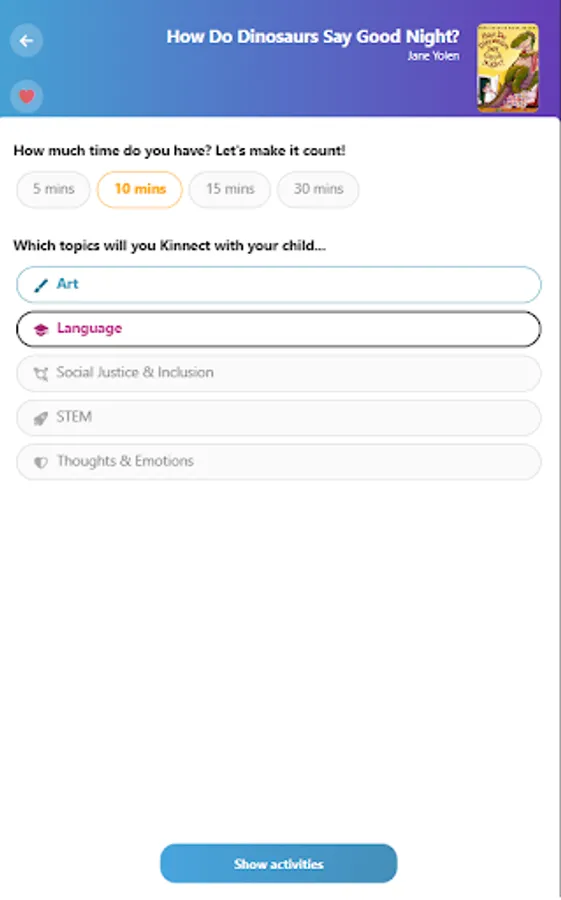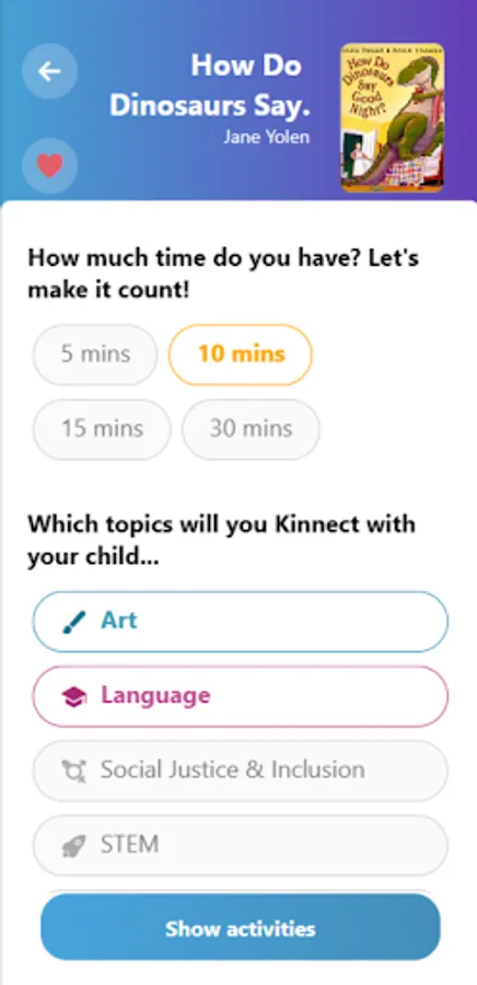 KinKin, your new favorite owl, supports you in spending as little as 30 seconds on the Kintales app. You and your child are off the screen for at least 10 minutes and connecting over their favourite books. There is an infinite amount of teacher-designed, AI generated activities you can do before, during, or after reading the book.