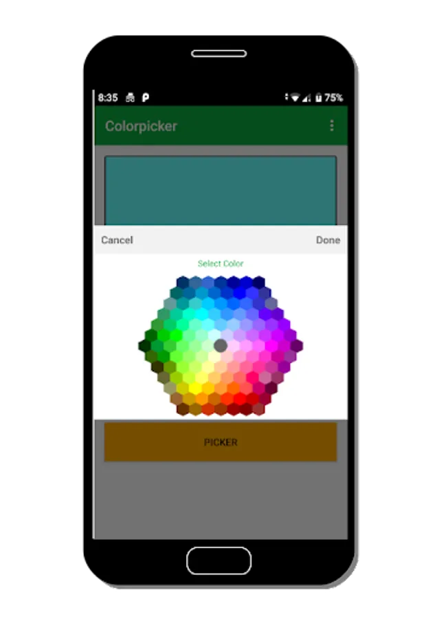 Color Picker App let you pick color from color palette and show the hex code for it.