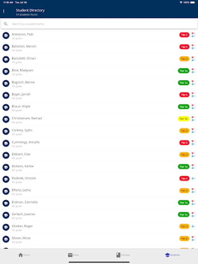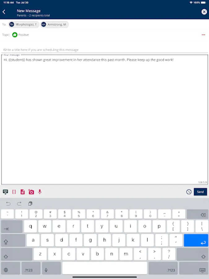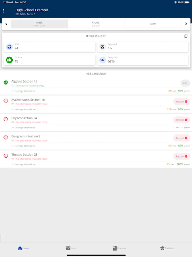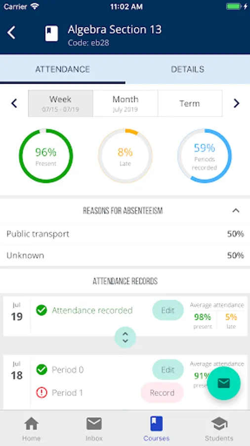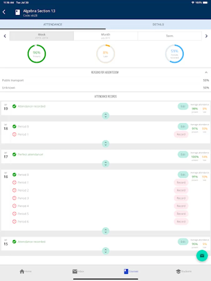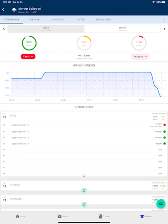 - Record attendance by swiping students names left or right, selecting reasons for absenteeism, and tracking minutes of lost instructional time