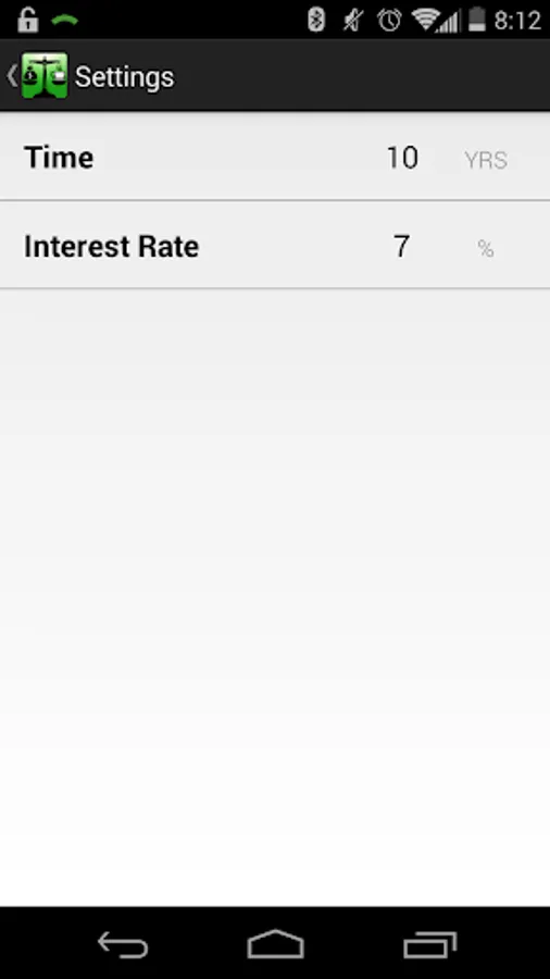By default, this app calculates compound interest over a period of 10 years, as thinking 10 years out is a good habit to get in. The interest rate is set to 7%, as this is the average return of a low risk index fund, such as a fund based on the S&P 500. Both length of time and interest rate can be modified in Settings.