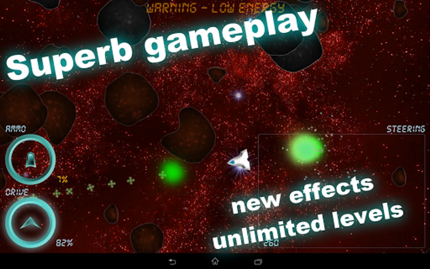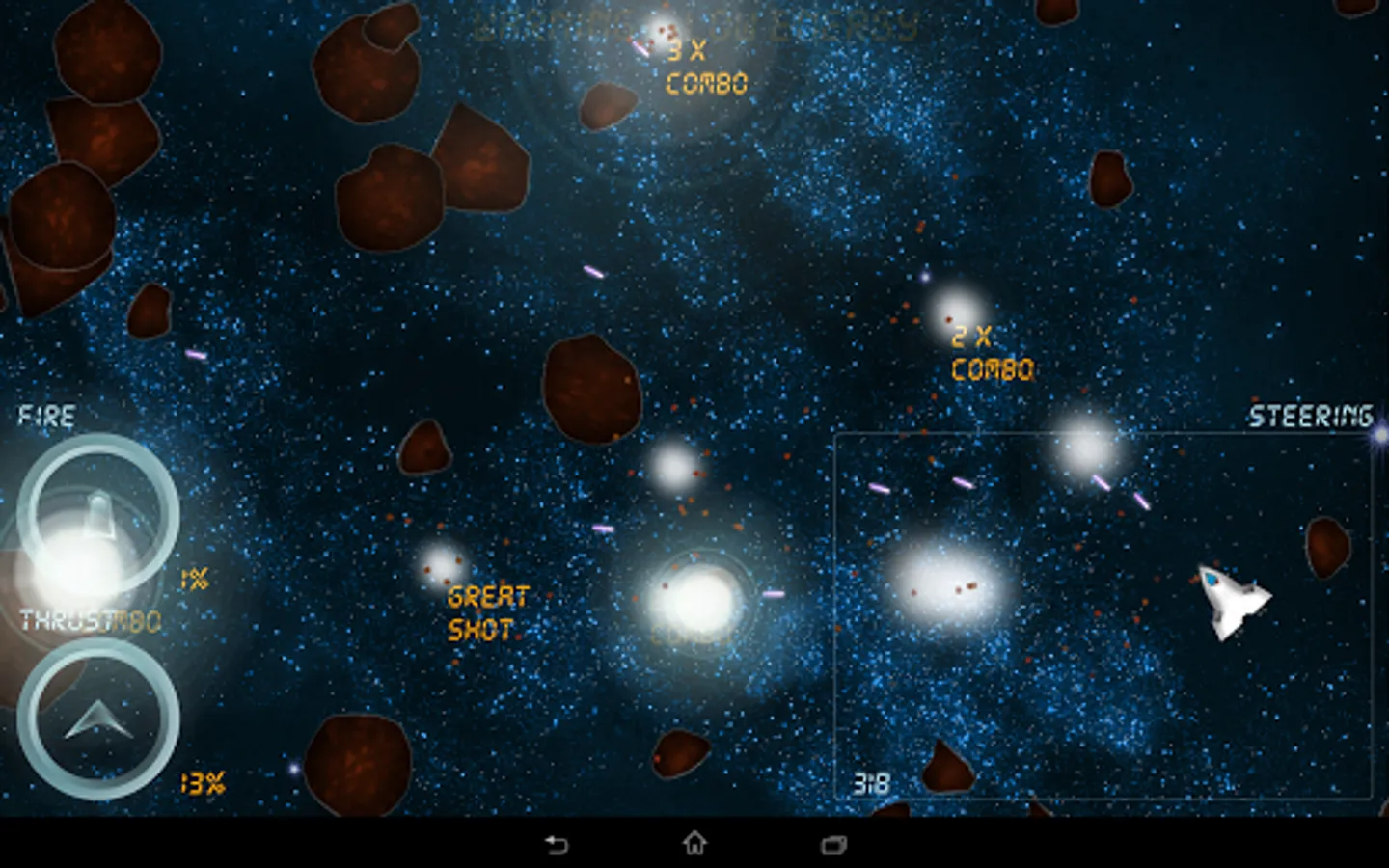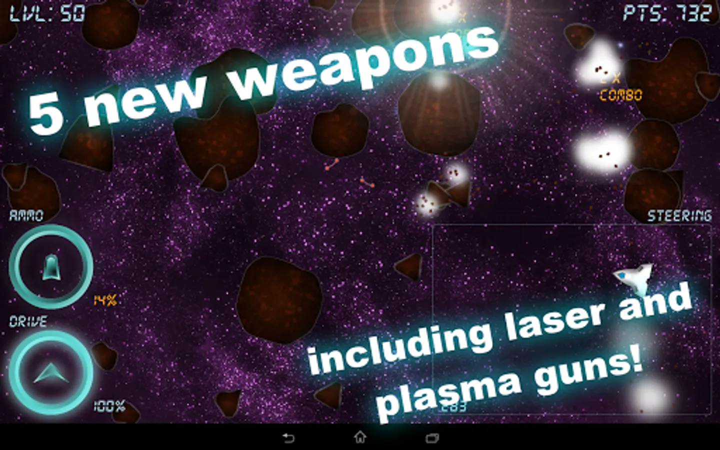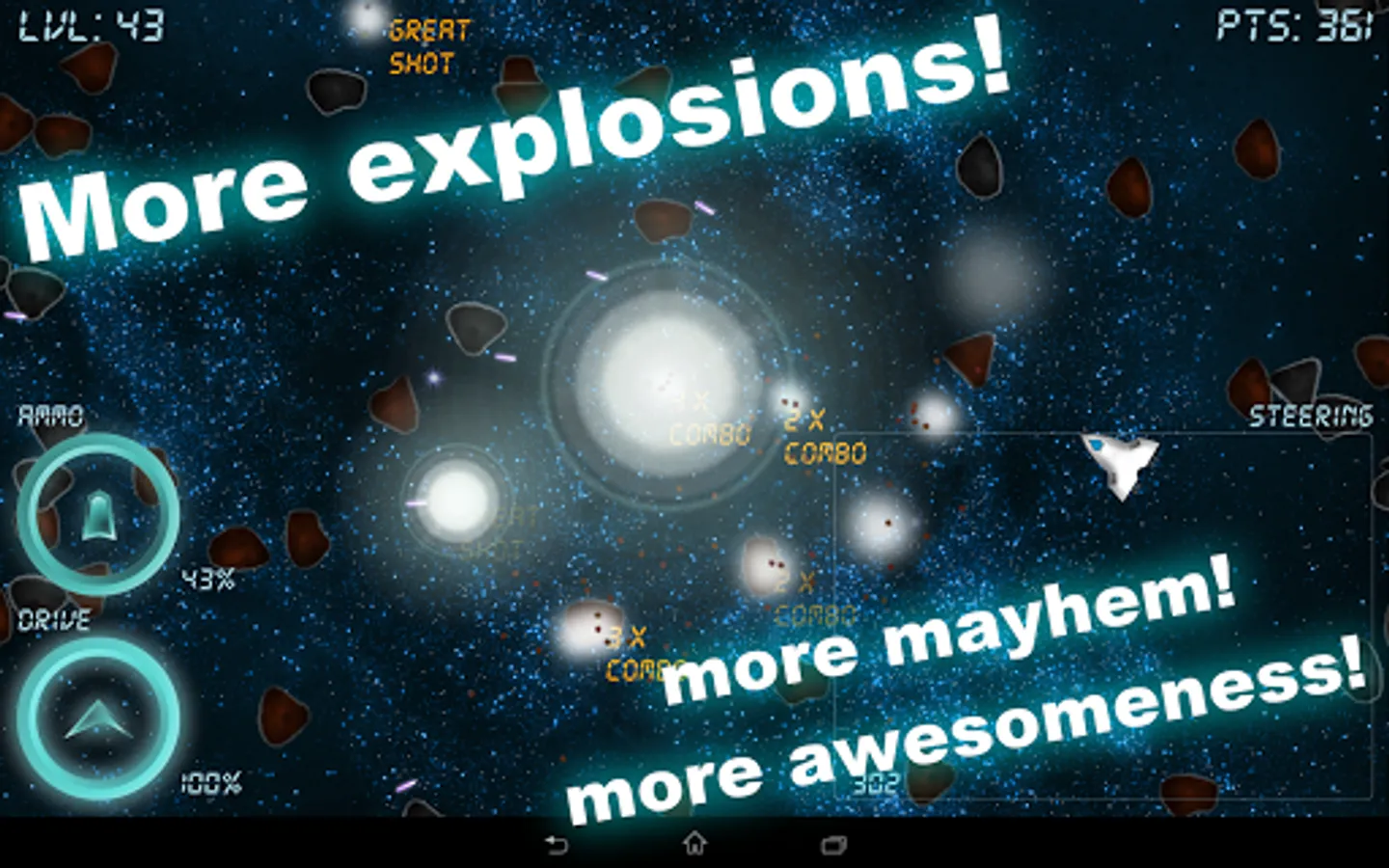 Your spaceship has encounter a massive pack of space rocks somewhere deep in outer space. Your mission is to avoid collisions and struggle to stay alive blasting as many space rocks as you possibly can. Shoot and dodge the space rocks to find your way through different galaxies and defense your galactic independence. Upgrade your ship's weapons from ion cannons to plasma guns and laser beams to blast harder space rocks in no-time! Gain experience and unlock the almighty antimatter weapon to finally dominate whole universe!