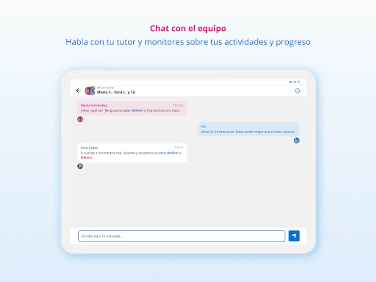 And since not everything is information, Kiprest offers an exclusive, permanent, and closed chat to the agents who participate directly in relation to the athlete. This is, on the one hand, the athlete himself, on the other his sports monitor and liaison, the GaituzSport specialist technician who guides, advises and coordinates the necessary support resources for the active participation of the athlete in equal opportunities in standardized sports physical activities .