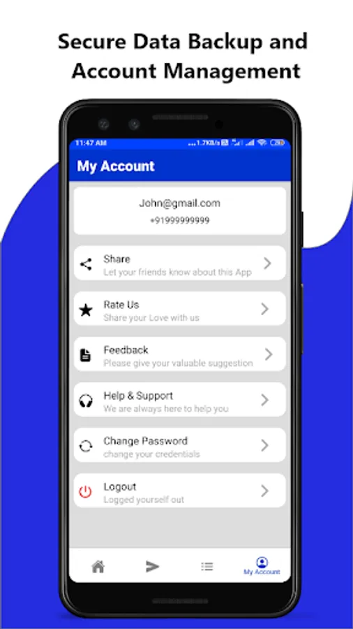 • 𝟏𝟎𝟎% 𝐚𝐮𝐭𝐨𝐦𝐚𝐭𝐢𝐜 𝐝𝐚𝐭𝐚 𝐛𝐚𝐜𝐤𝐮𝐩 – Your data is always backed up and you can access your data on my mobile by just entering your mobile number and password.