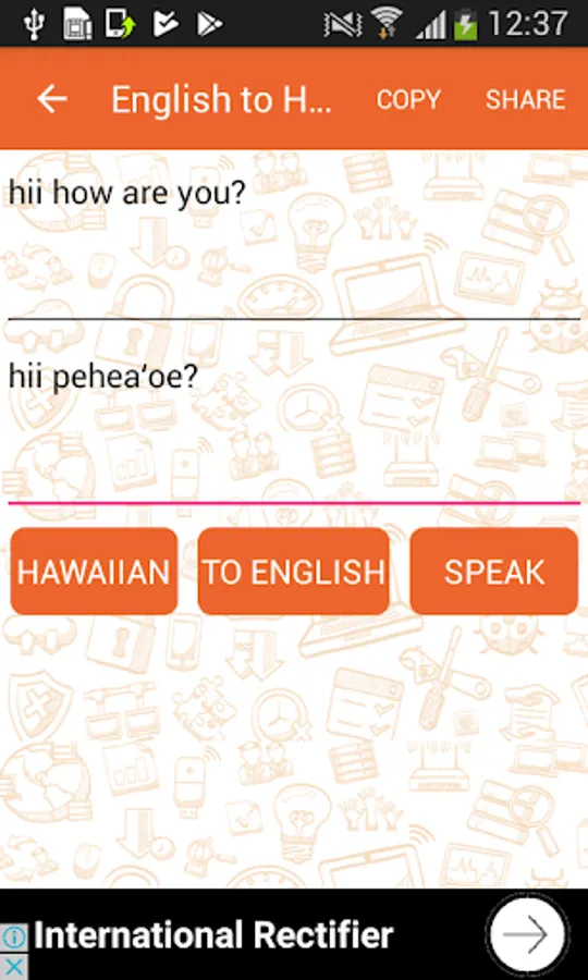 With this application your requirement of English to Hawaiian conversion and Hawaiian to English conversion will easily be fulfilled. You will be able to convert any tough word once you start using this English to Hawaiian translation application .You will be able to understand the Hawaiian equivalent of the word using this English to Hawaiian translator. One can also consider this application as English to Hawaiian dictionary that can help one improve a lot. As this is a Hawaiian to English and English to Hawaiian typewriter, you will easily be able to use it. A lot of people have taken benefit from this English to Hawaiian writing app and then used it successfully thereafter. Once you start using this application you will surely be able to convert English to Hawaiian and Hawaiian to English. You will also be able to learn English grammar and Hawaiian grammar as you keep using it. For those who want to learn English speaking or Hawaiian speaking this application is the best. You will be able to learn the language in ways that you have never even thought of. You will easily be able to understand the words in English and words of Hawaiian once you start using our application.