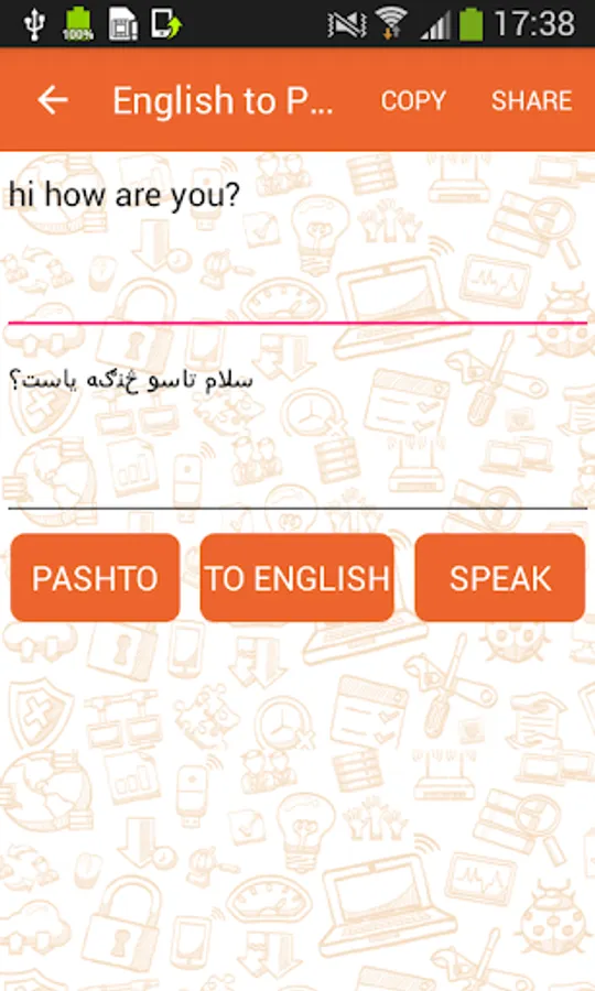 With this application your requirement of English to Pashto conversion and Pashto to English conversion will easily be fulfilled. You will be able to convert any tough word once you start using this English to Pashto translation application .You will be able to understand the Pashto equivalent of the word using this English to Pashto translator. One can also consider this application as English to Pashto dictionary that can help one improve a lot. As this is a Pashto to English and English to Pashto typewriter, you will easily be able to use it. A lot of people have taken benefit from this English to Pashto writing app and then used it successfully thereafter. Once you start using this application you will surely be able to convert English to Pashto and Pashto to English. You will also be able to learn English grammar and Pashto grammar as you keep using it. For those who want to learn English speaking or Pashto speaking this application is the best. You will be able to learn the language in ways that you have never even thought of. You will easily be able to understand the words in English and words of Pashto once you start using our application.