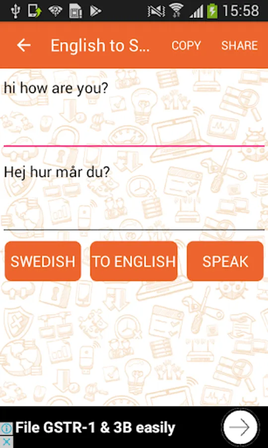 With this application your requirement of English to Swedish conversion and Swedish to English conversion will easily be fulfilled. You will be able to convert any tough word once you start using this English to Swedish translation application .You will be able to understand the Swedish equivalent of the word using this English to Swedish translator. One can also consider this application as English to Swedish dictionary that can help one improve a lot. As this is a Swedish to English and English to Swedish typewriter, you will easily be able to use it. A lot of people have taken benefit from this English to Swedish writing app and then used it successfully thereafter. Once you start using this application you will surely be able to convert English to Swedish and Swedish to English. You will also be able to learn English grammar and Swedish grammar as you keep using it. For those who want to learn English speaking or Swedish speaking this application is the best. You will be able to learn the language in ways that you have never even thought of. You will easily be able to understand the words in English and words of Swedish once you start using our application.