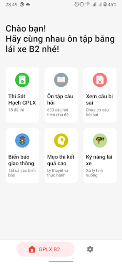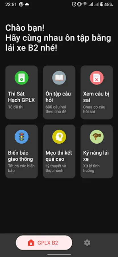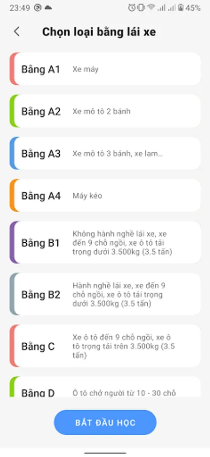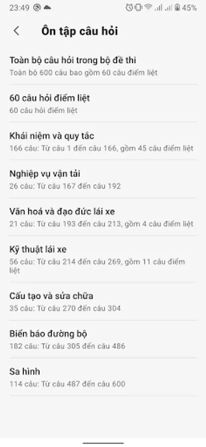 • Full of 600 theoretical questions on the GPLX test used for testing and licensing of road motor vehicles of all kinds by A1, A2, A3, A4, B1, B2, C, D, E, F