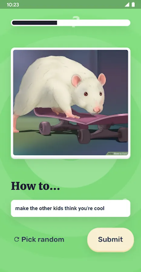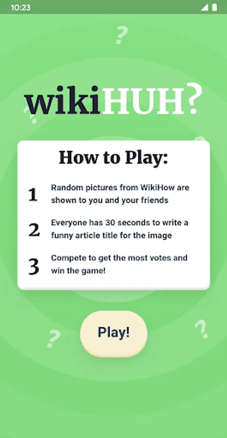 In WikiHuh, you and your friends compete in a social, creative, party game to write funny titles for wikiHow images. Each round, a random picture from wikiHow will be shown to all players, and everyone has 30 seconds to write an article title to go with the image. Then, they compete to get the most votes and win the game!