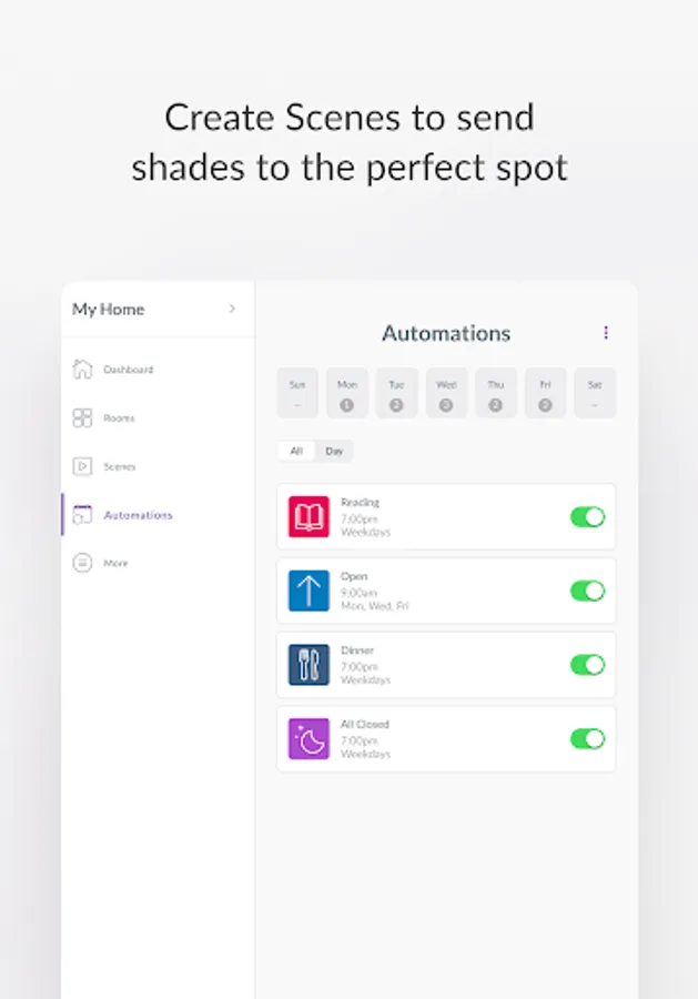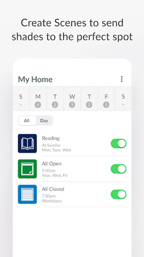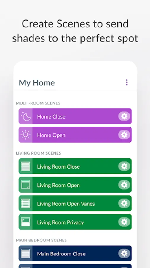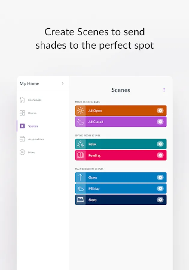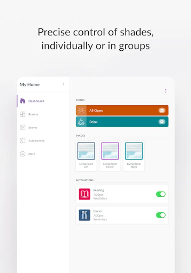 * Create customized shade position settings called "Scenes" for convenience, or to manage your natural lighting and privacy needs throughout the day.