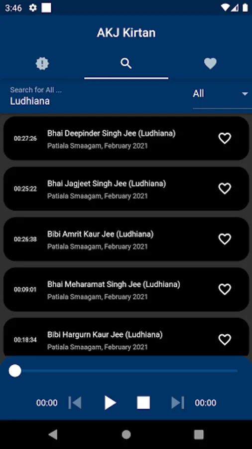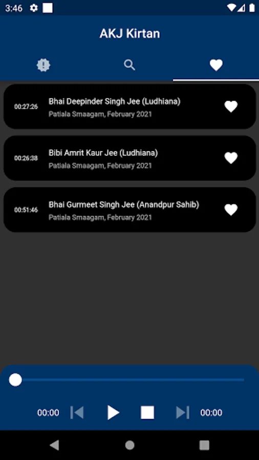 AKJ Kirtan App does not stream any of the samaagams , all the streaming links are from a third party available free on the internet - www.akj.org. If anyone finds that we are violating by broadcasting any copyright-protected data email us the name, we will remove the name from our apps based on your email request. Email at hardeep0khalsa122@gmail.com or byteharman0101@gmail.com.