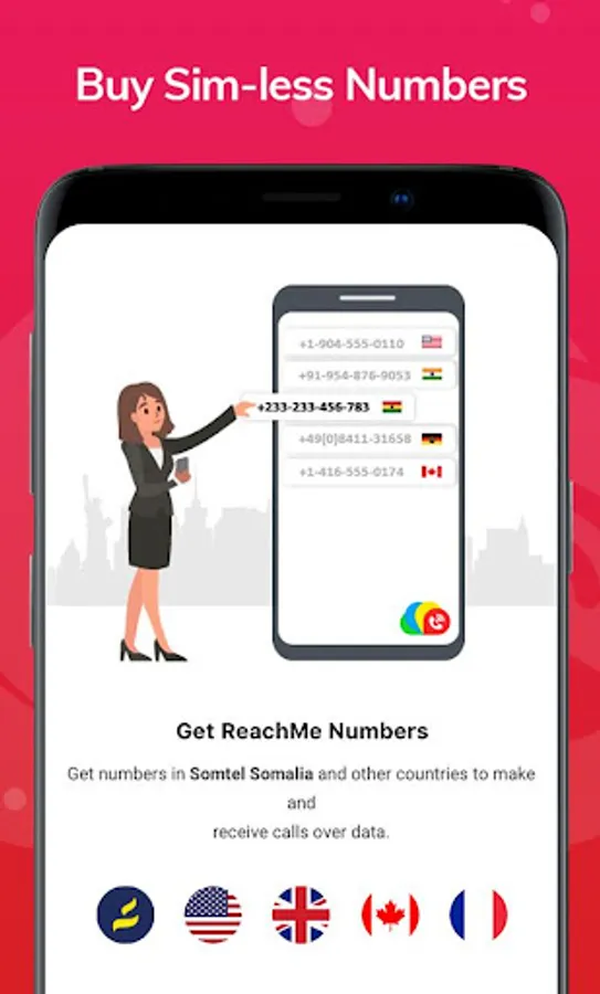 With ReachMe Numbers, you can buy a virtual number from Somtel Somalia, US, UK, France and Canada.