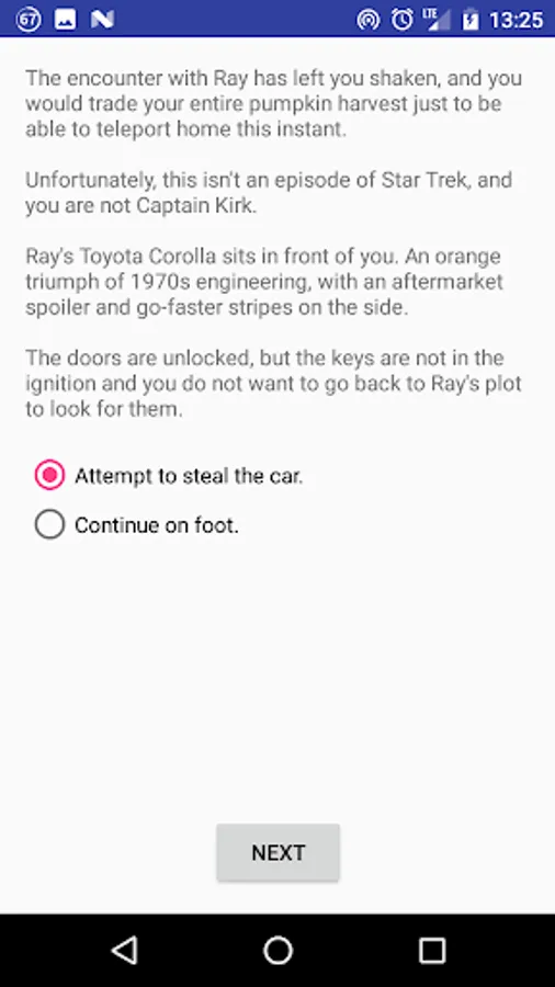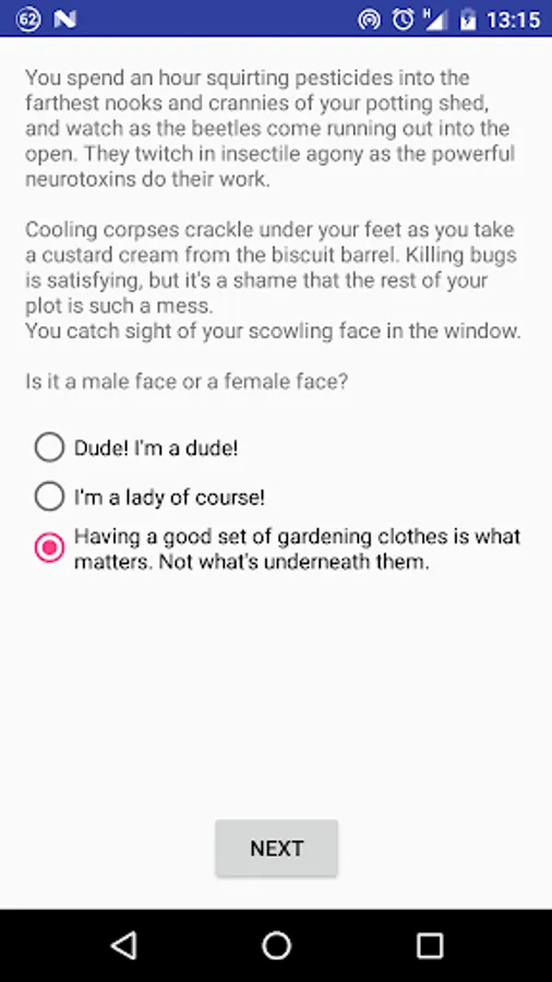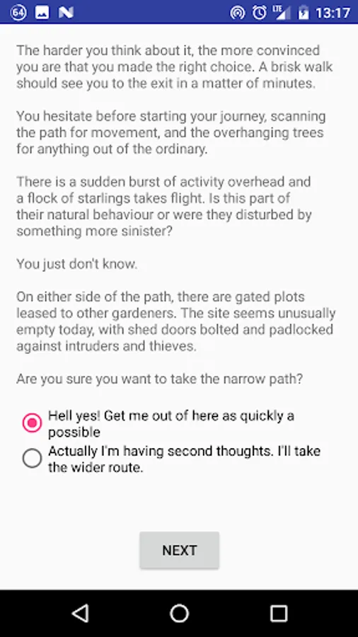 Make your choice in this brand new text adventure, and fight or sneak your way through an allotment site in the North of England, combat deadly worms and the shambling corpses of your former friends.