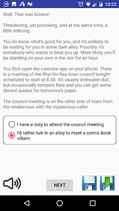 The game allows you to save your progress before making difficult decisions, and integrates Google's Text to Speech engine, allowing you to have the game narrated to you.