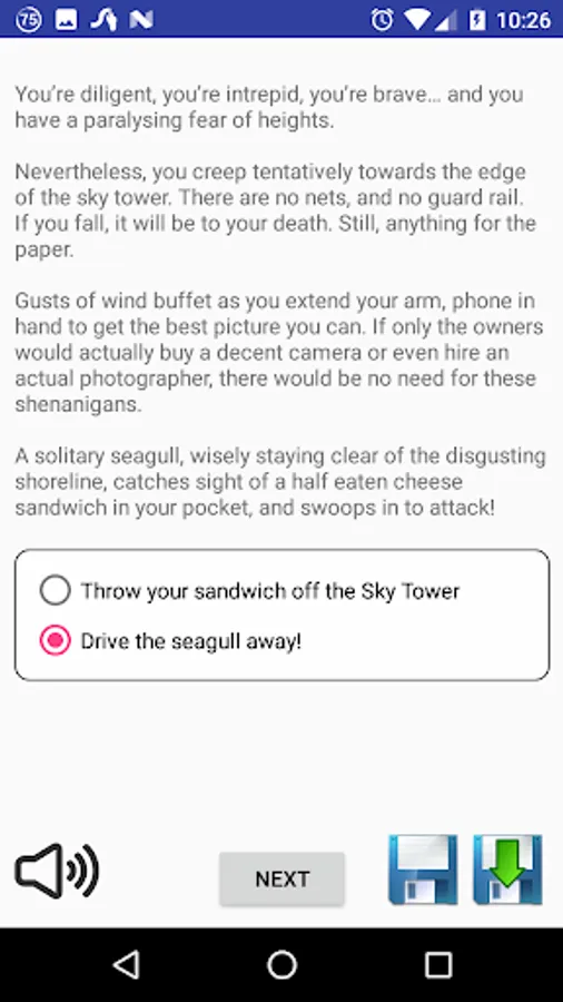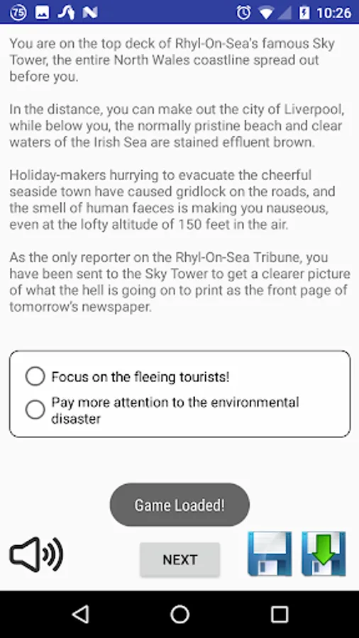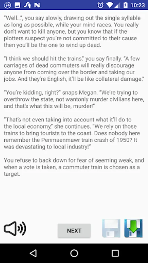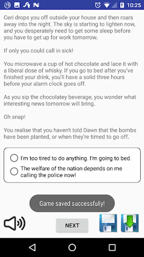 The game integrates Google's Text to Speech engine, allowing you to have the game narrated to you. And the full ad-free version allows you to save your progress before making difficult decisions,