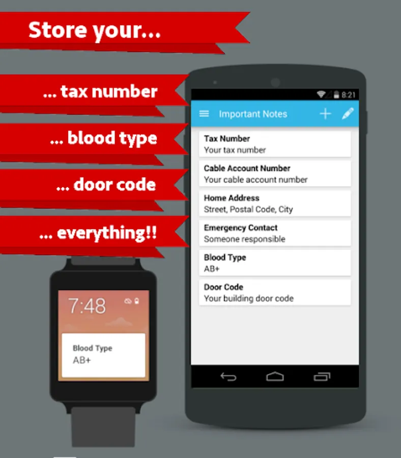 Short Notes is available for Android Wear! Never again you will have to get your wallet to know your tax id.