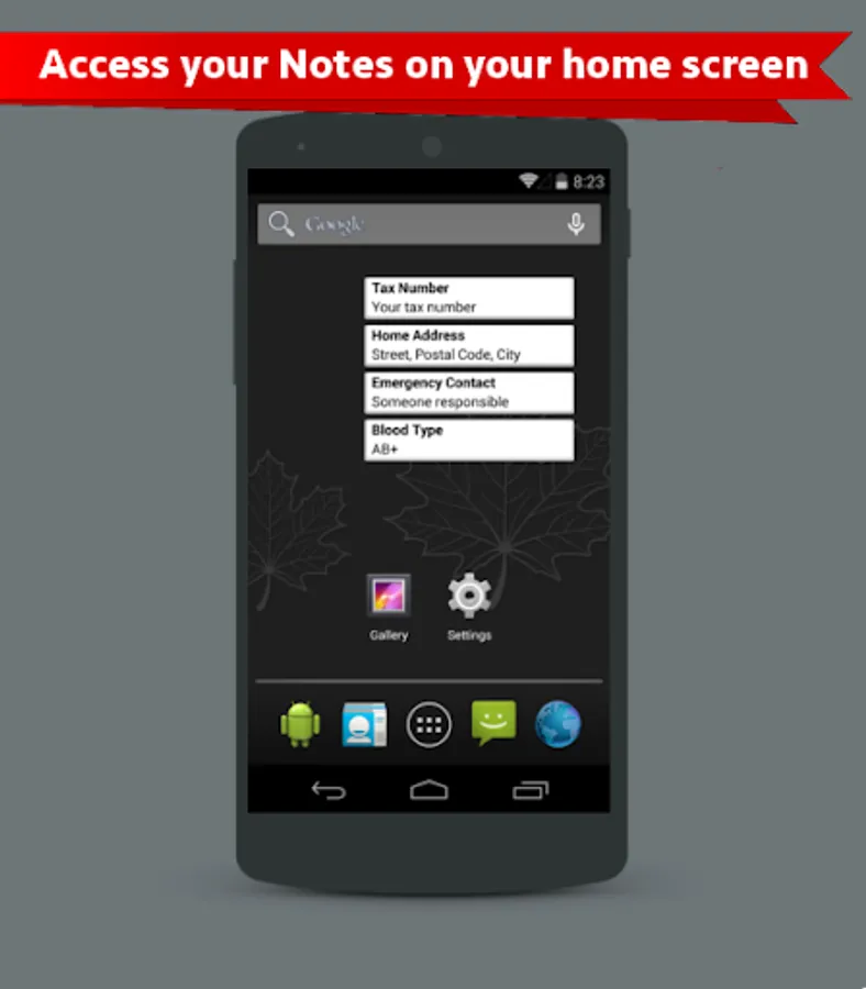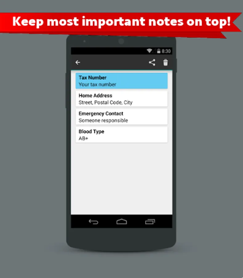 Important Notes is specifically designed for very short notes, you can use it to keep your ID number or tax ID at hand.