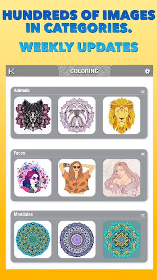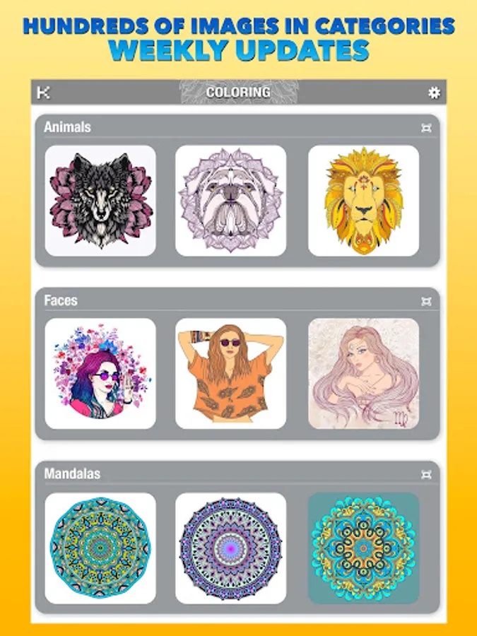 - A wide variety of pages to color: we discover the most beautifully drawn images and organize them in more than 20 categories (animals, flowers, mandalas, faces, and much more).
