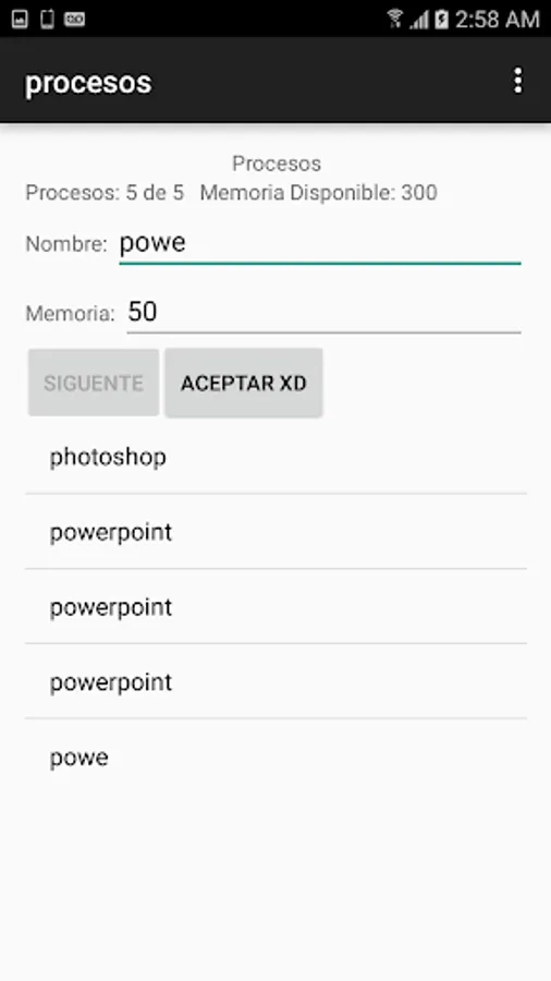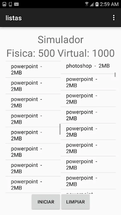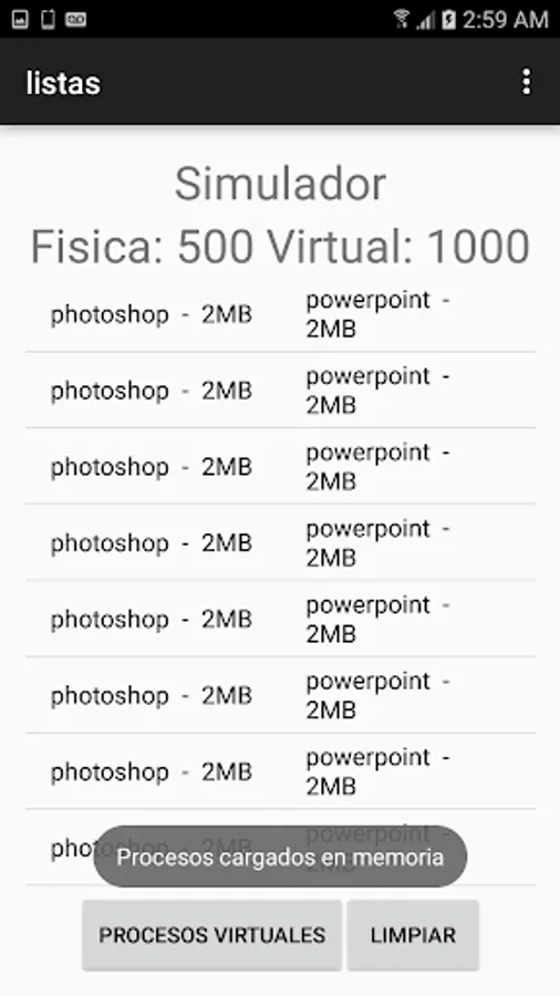 Simulator memory processes, seen as running and as they are moved from physical memory to the virtual and vice versa