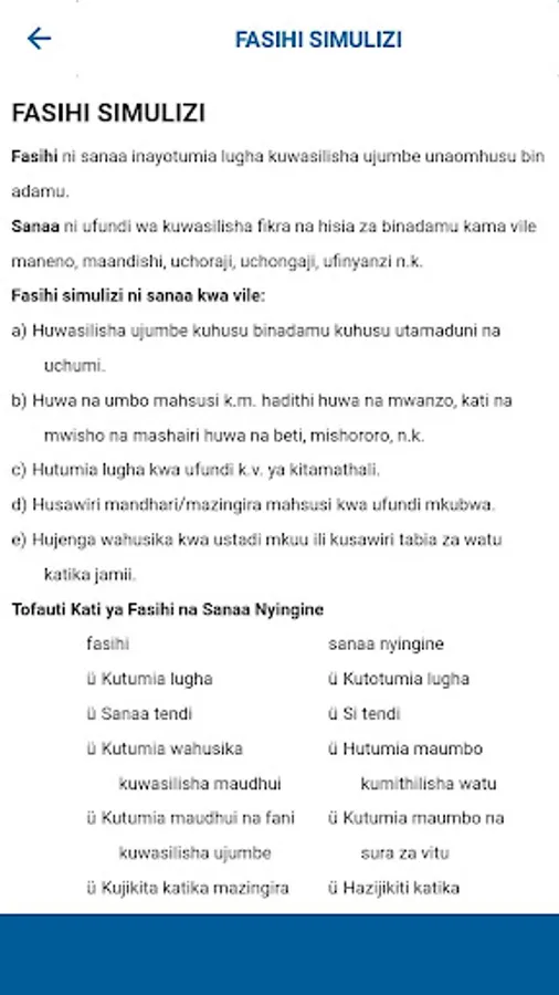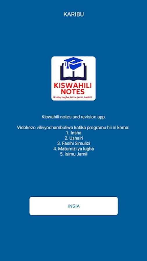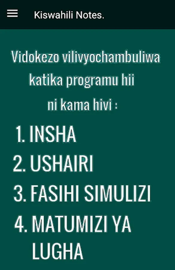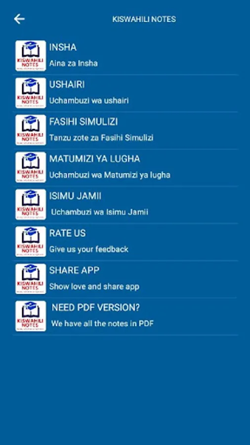 This app is meant for students, teachers and everyone wishing to study. It contains complete Swahili topics that have been shortened and made easy to understand.