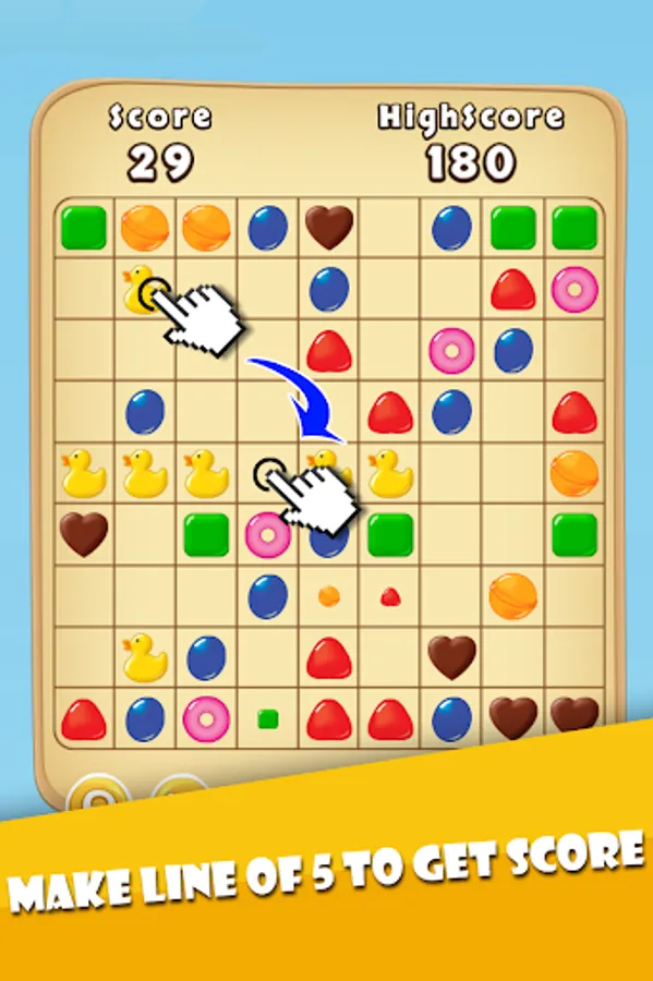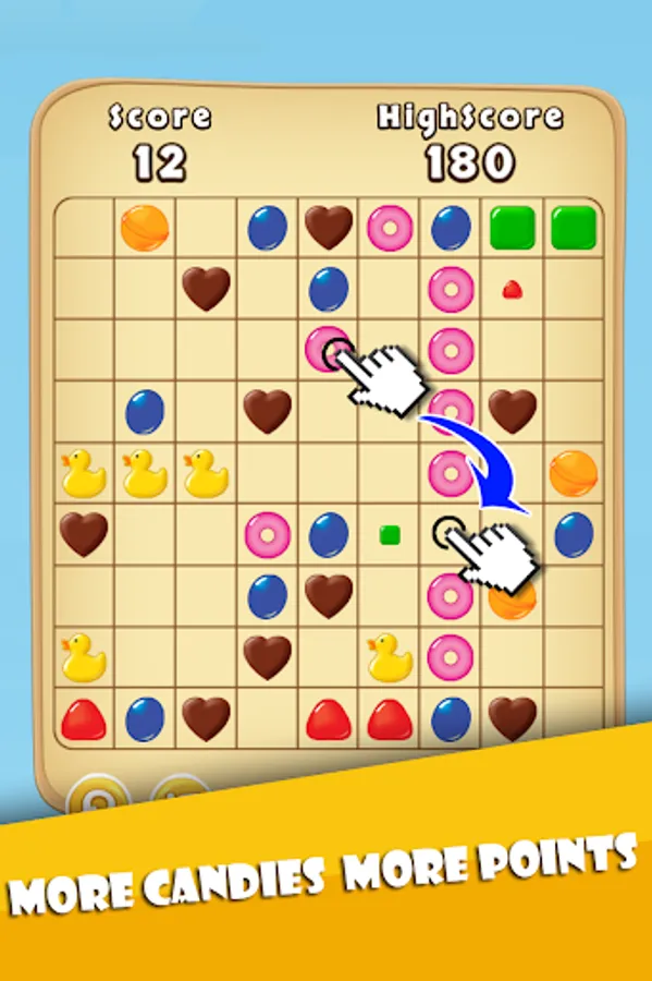 You have to move the candies of the same color to make horizontal, vertical, diagonal lines of 5 candies or more . The more candy in the same line the more points you get.
