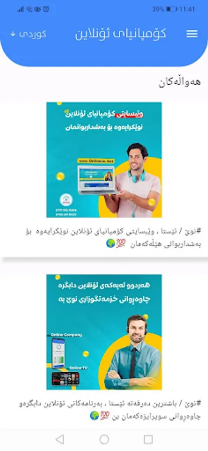 کۆمپانیای ئۆنلاین /کۆمپانیایەکی بواری دابینکردنی خزمەتگوزاری ئینتەرنێتە لە هەرێمی کوردستان لە کۆمپانیای ئۆنلاین سەرجەم پێداویستیەکانی هێڵی ئینتەرنێت بەردەستە و ئۆفەری تایبەتمان هەیە بۆ دامەزراوە حکومی و کەرتە تایبەتەکان . ئێمە خاوەن تیمێکی پێشەنگین بۆ دامەزراندن و گەیاندنی ئینتەرنێت بە ئێوەی .بەڕێز و بەردەوامین لە خزمەتکردن و جێبەجێ کردنی داواکاری کڕیاران و بەژداربوانمان .