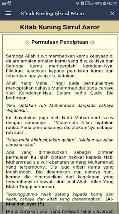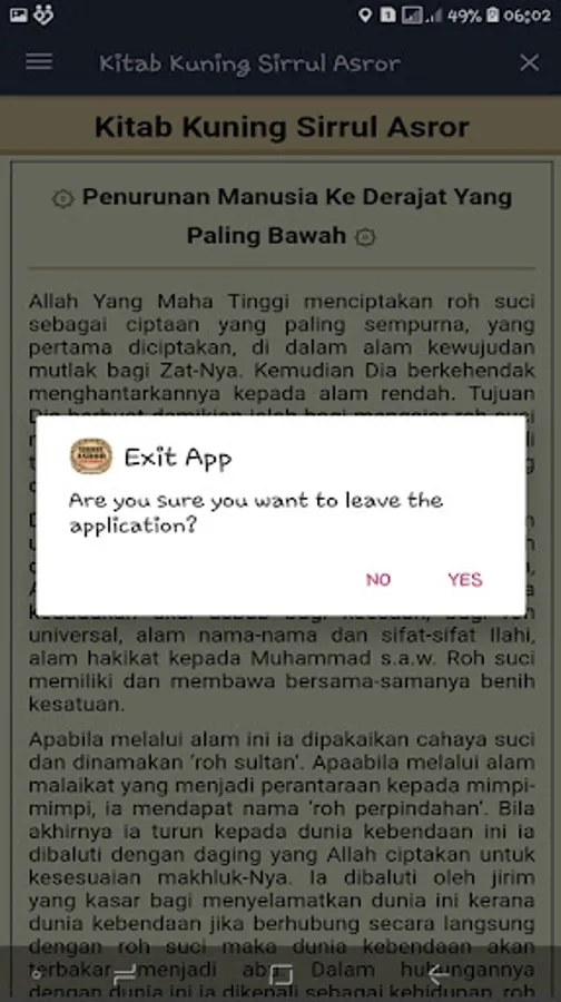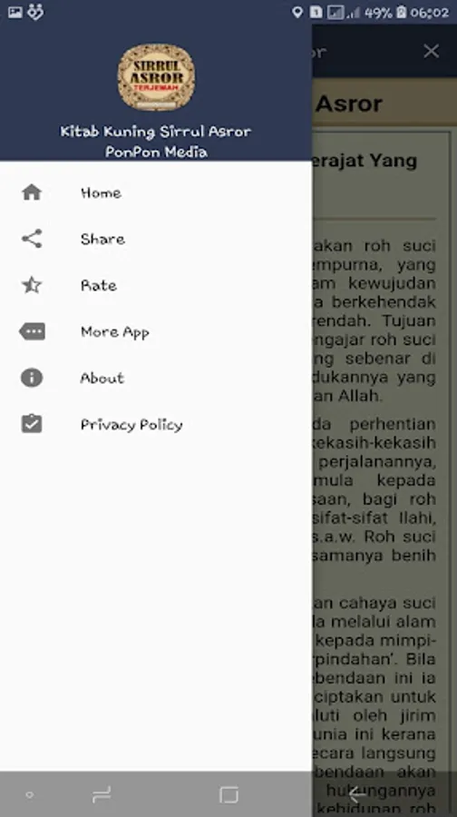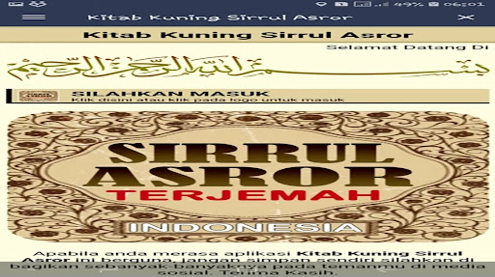 This Sirrul Asror Yellow Book application may still be far from perfect, therefore we are very open to receiving criticism and suggestions from all users. You can send criticism and suggestions for the development of this application. Hopefully this Kitab Kuning Sirrul Asror application is useful for all of us and congratulations on using this Kitab Kuning Sirrul Asror application from your device. Thank you.