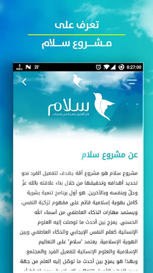 "Peace" is an ambitious global project to help the individual access to psychological balance and peace sought by scientific and practical approach is built on the foundations of Islamic teachings and positive psychology and emotional intelligence.