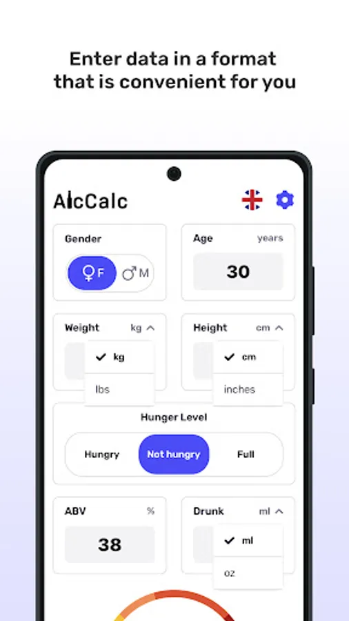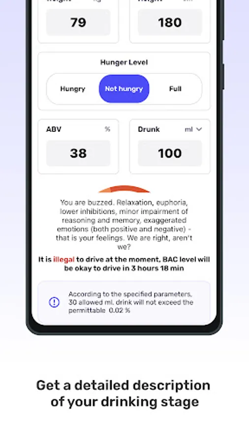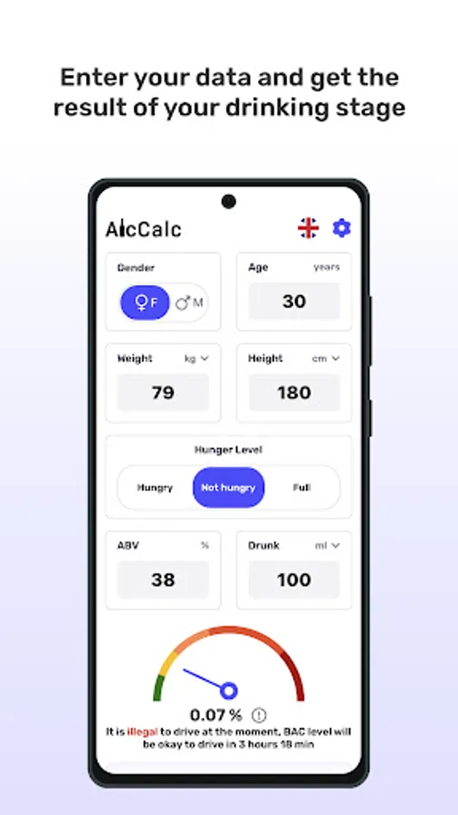 Alcohol calculator that you want to use! Select your country, enter your details, such as age, height, weight, gender, hunger level, ABV, and how much did you drink, and easily calculate your blood alcohol content(BAC) level. Explore the exact time you can drive legally after a night out or a couple of beers in the evening.
