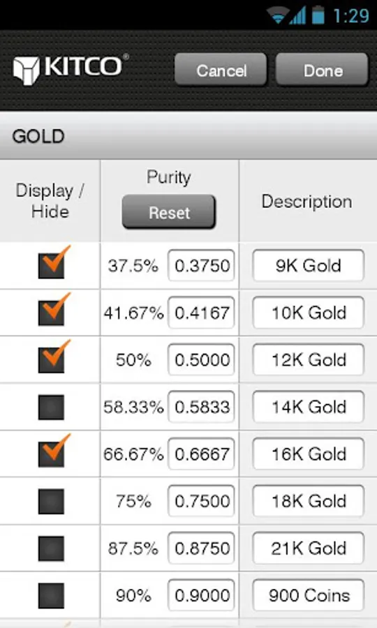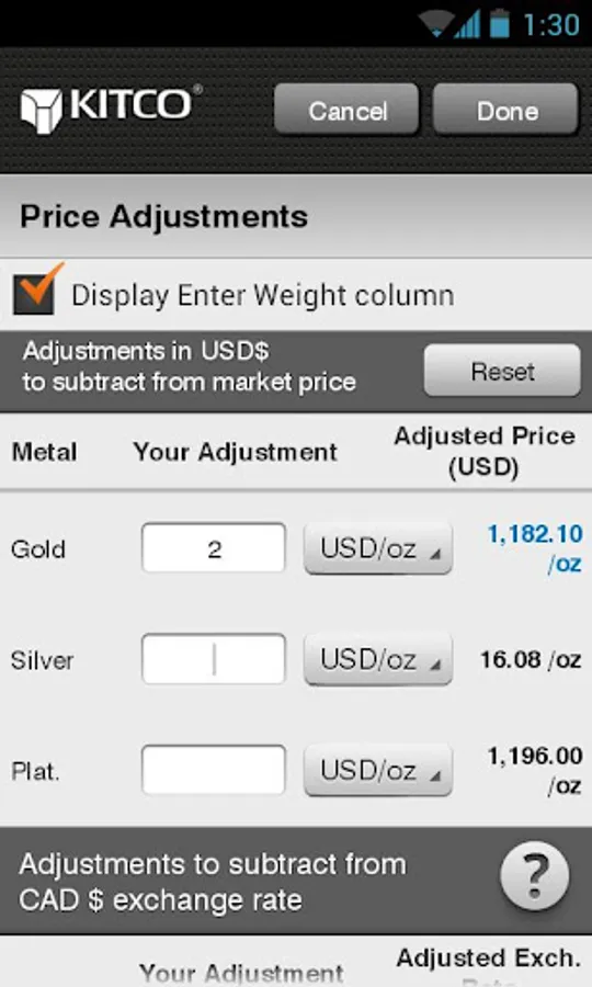 Customize your calculation options with fully editable product purities and descriptions. Make quick and easy live price adjustments for gold, silver and platinum. Enter any percent of market value.