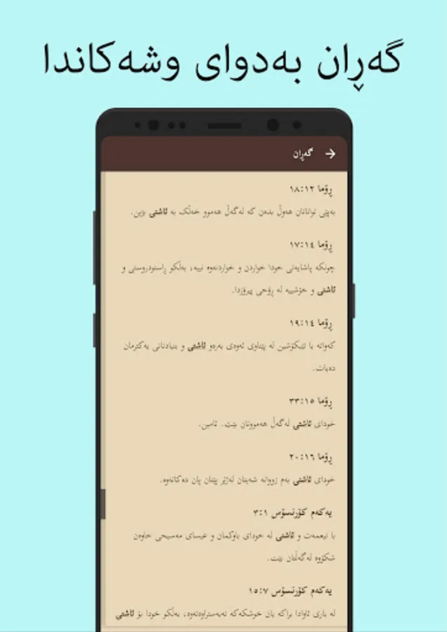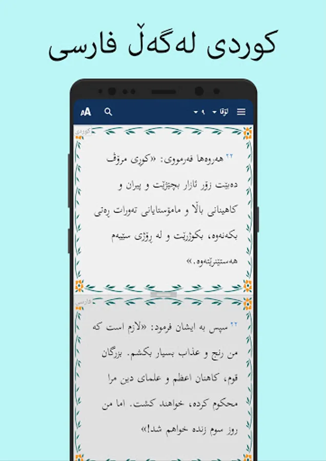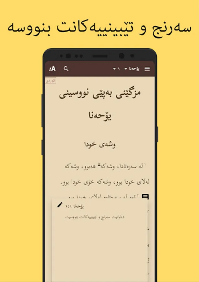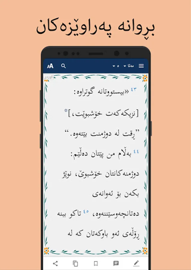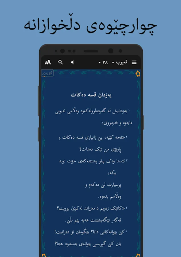 This app is the entire Sorani Kurdish Bible available offline. It includes all the Christian scriptures, the Torah, Zabuur and Incil. Read the words of Jesus (Isa) in the gospel for yourself in your mother tongue and share it with your friends and family. Welcome!