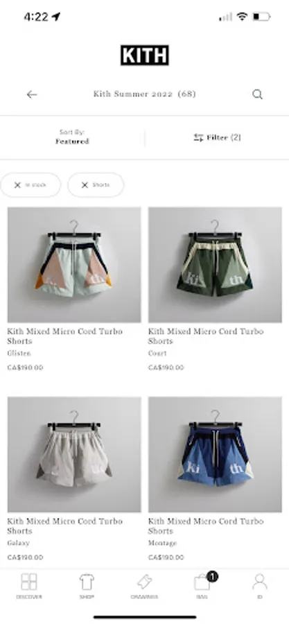 The Kith App allows users to view curated products, content they love and receive additional benefits such as gaining access to app-only drawings for exclusive products. You’ll find 5 tabs on your app—Discover, Shop, Drawings, Bag and ID.