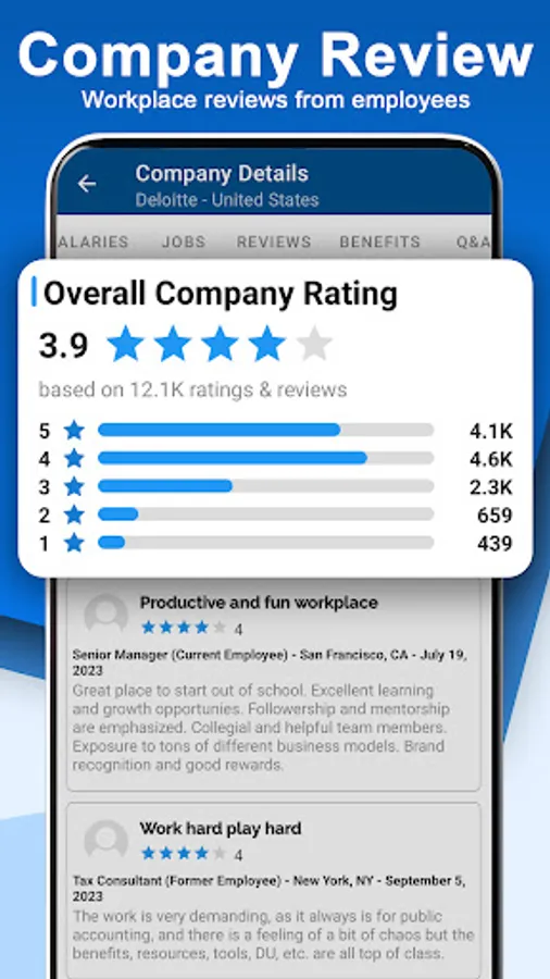 🏢 Company Insights: Make informed decisions about potential employers with access to over 700 million company ratings and reviews. Discover what current and former employees have to say about their workplace experiences.